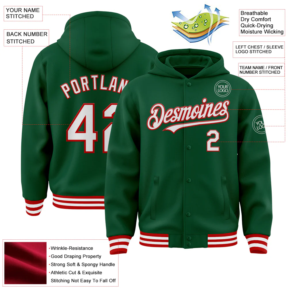 Custom Kelly Green White-Red Bomber Full-Snap Varsity Letterman Hoodie Jacket