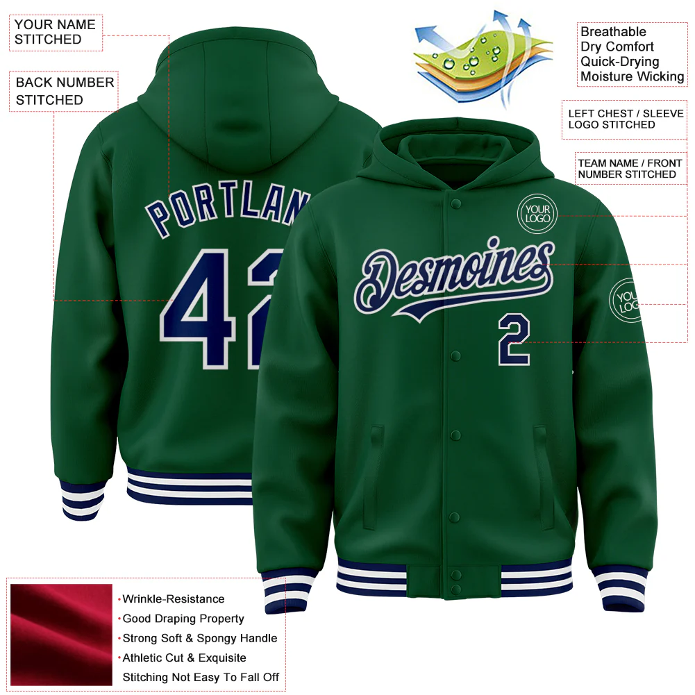 Custom Kelly Green Navy-White Bomber Full-Snap Varsity Letterman Hoodie Jacket