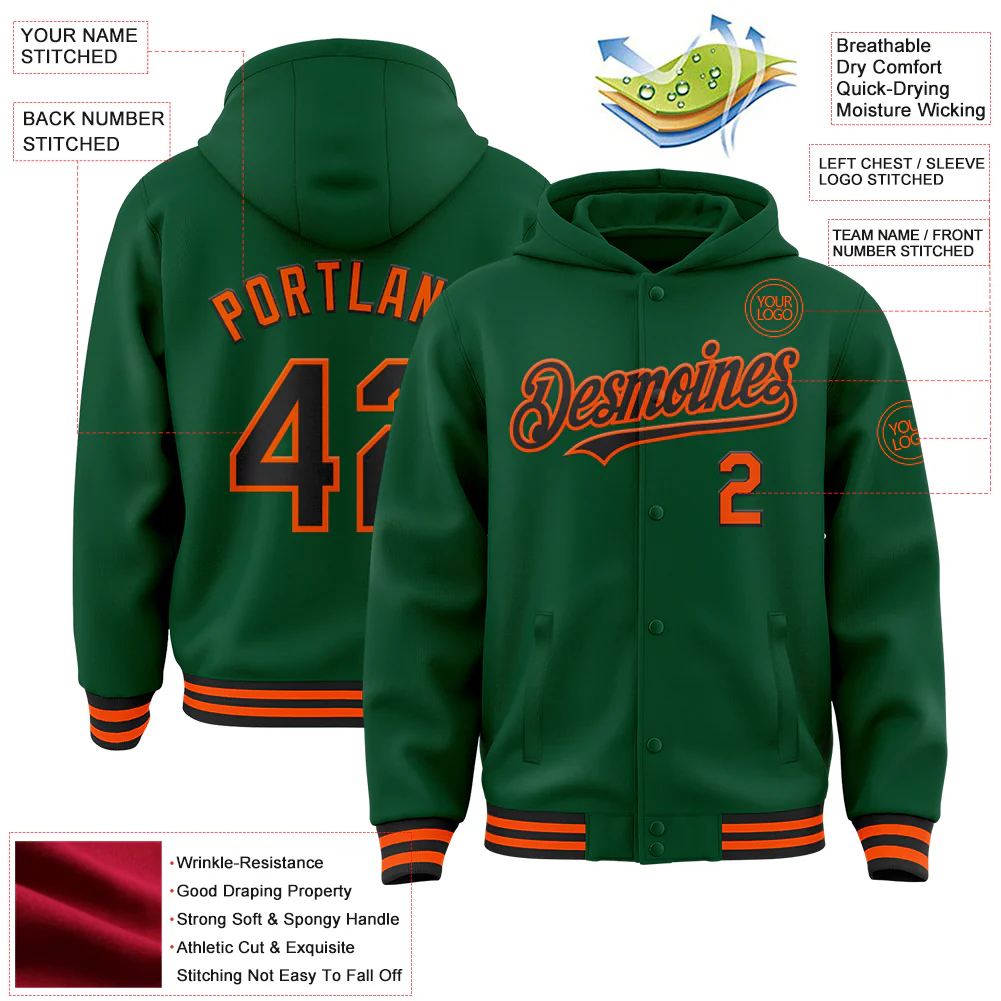 Custom Kelly Green Black-Orange Bomber Full-Snap Varsity Letterman Hoodie Jacket