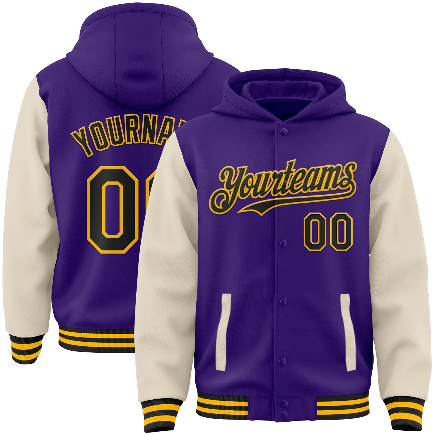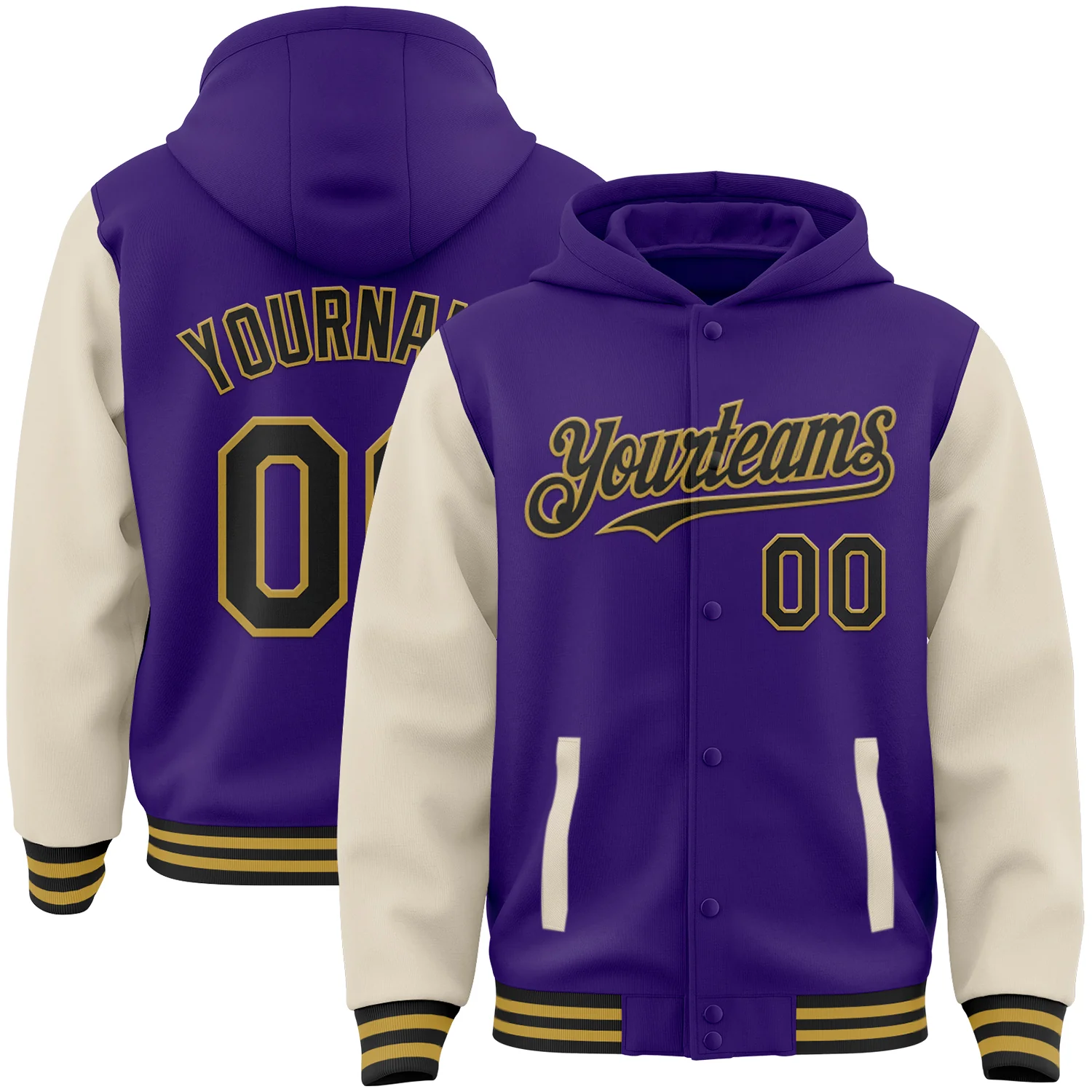 Custom Purple Black Cream-Gold Bomber Full-Snap Varsity Letterman Two Tone Hoodie Jacket