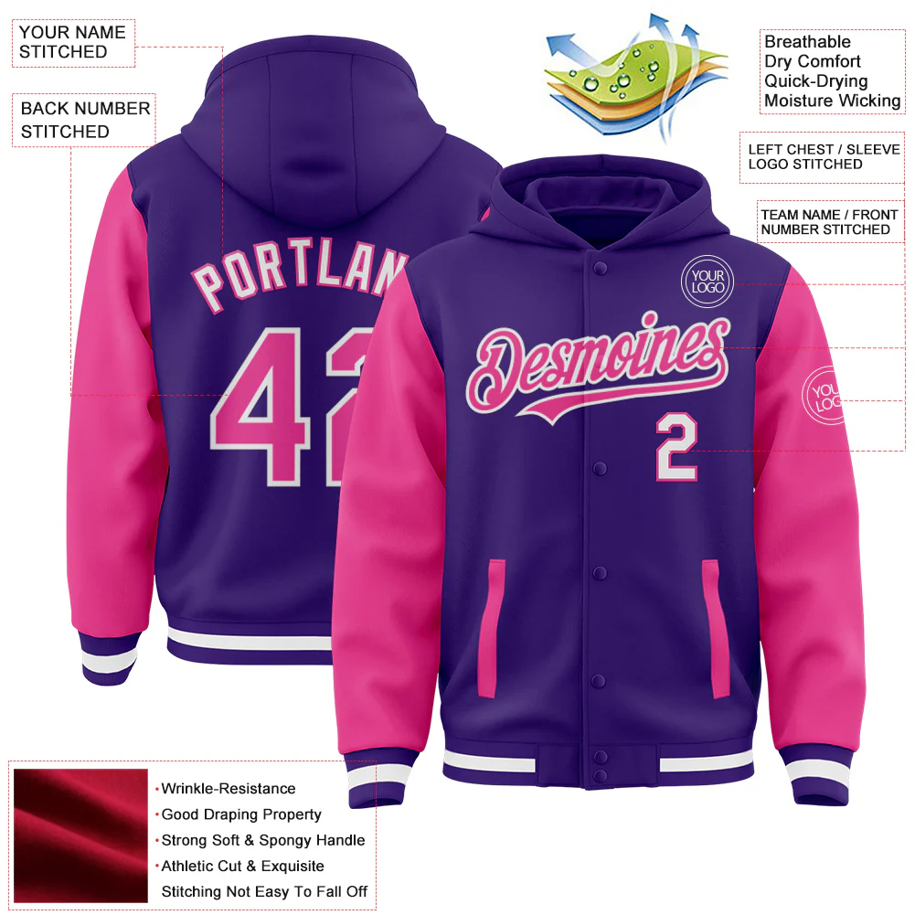 Custom Purple Pink-White Bomber Full-Snap Varsity Letterman Two Tone Hoodie Jacket