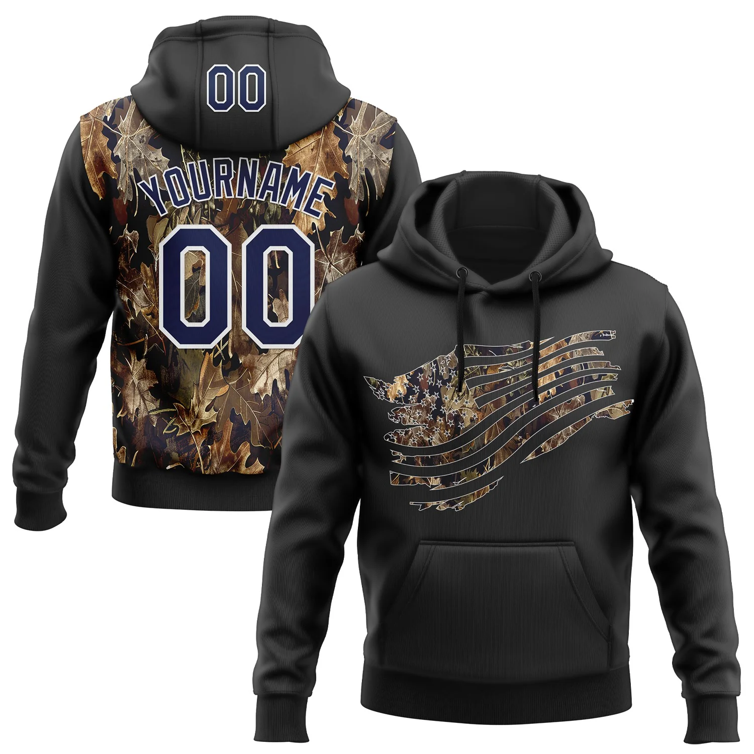 Custom Stitched Black Navy-White 3D Pattern Design Tree Camo American Flag Hunting Sports Pullover Sweatshirt Hoodie