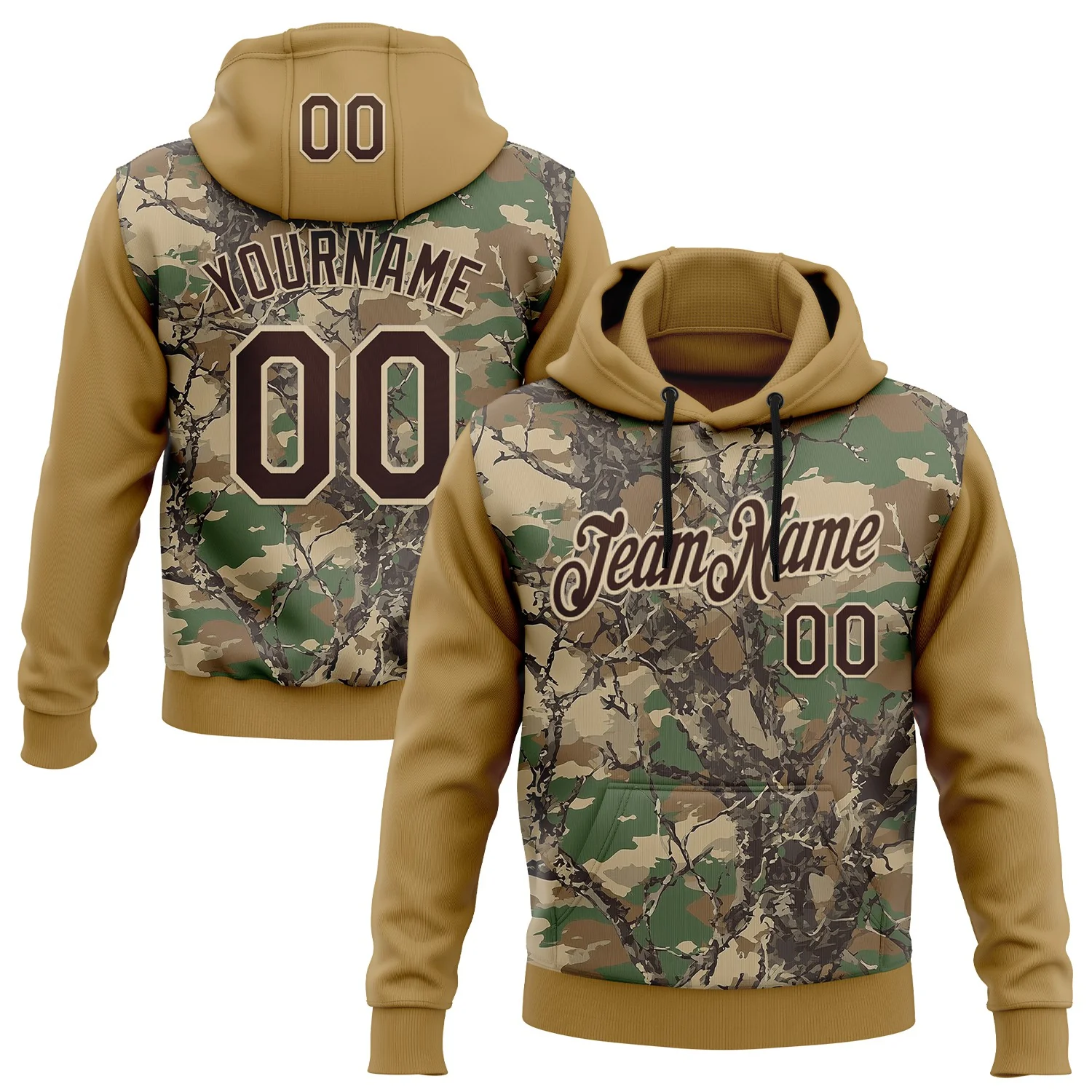 Custom Stitched Old Gold Brown-Cream 3D Pattern Design Tree Camo Hunting Sports Pullover Sweatshirt Hoodie
