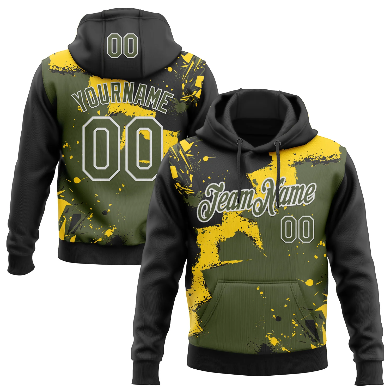 Custom Stitched Black Olive Yellow-White 3D Pattern Design Splash Torn Paper Style Sports Pullover Sweatshirt Hoodie