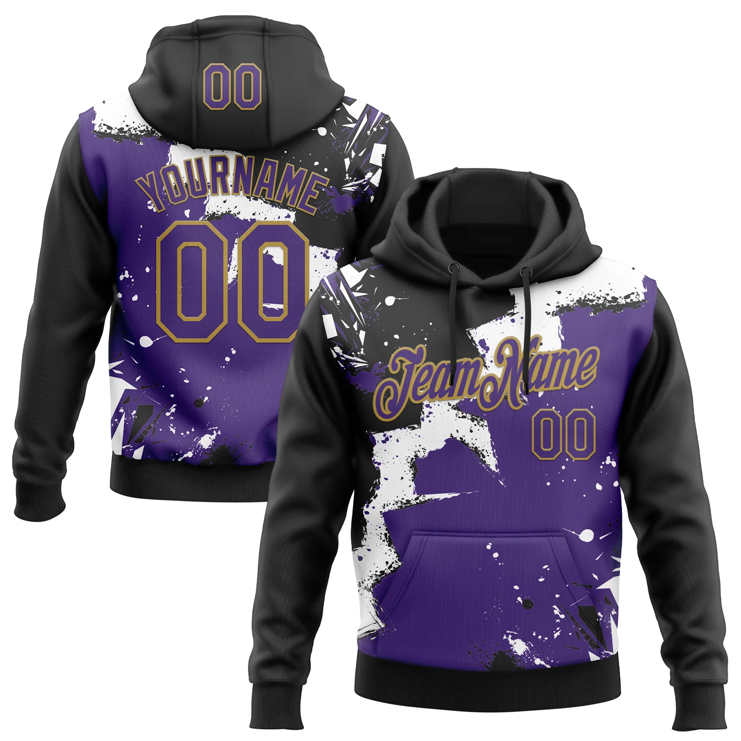 Custom Stitched Black Purple Old Gold-White 3D Pattern Design Splash Torn Paper Style Sports Pullover Sweatshirt Hoodie