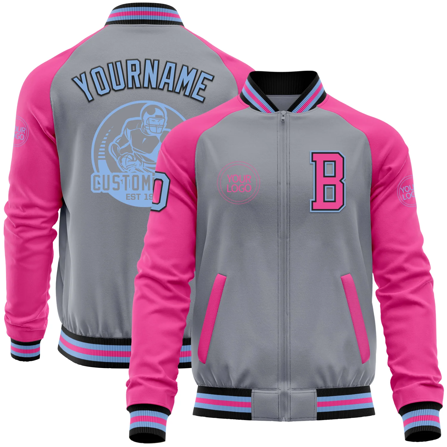 Custom Gray Light Blue Black-Pink Bomber Varsity Letterman Two Tone Zipper Jacket