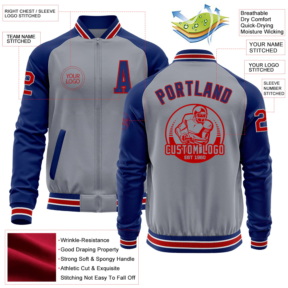 Custom Gray Red-Royal Bomber Varsity Letterman Two Tone Zipper Jacket