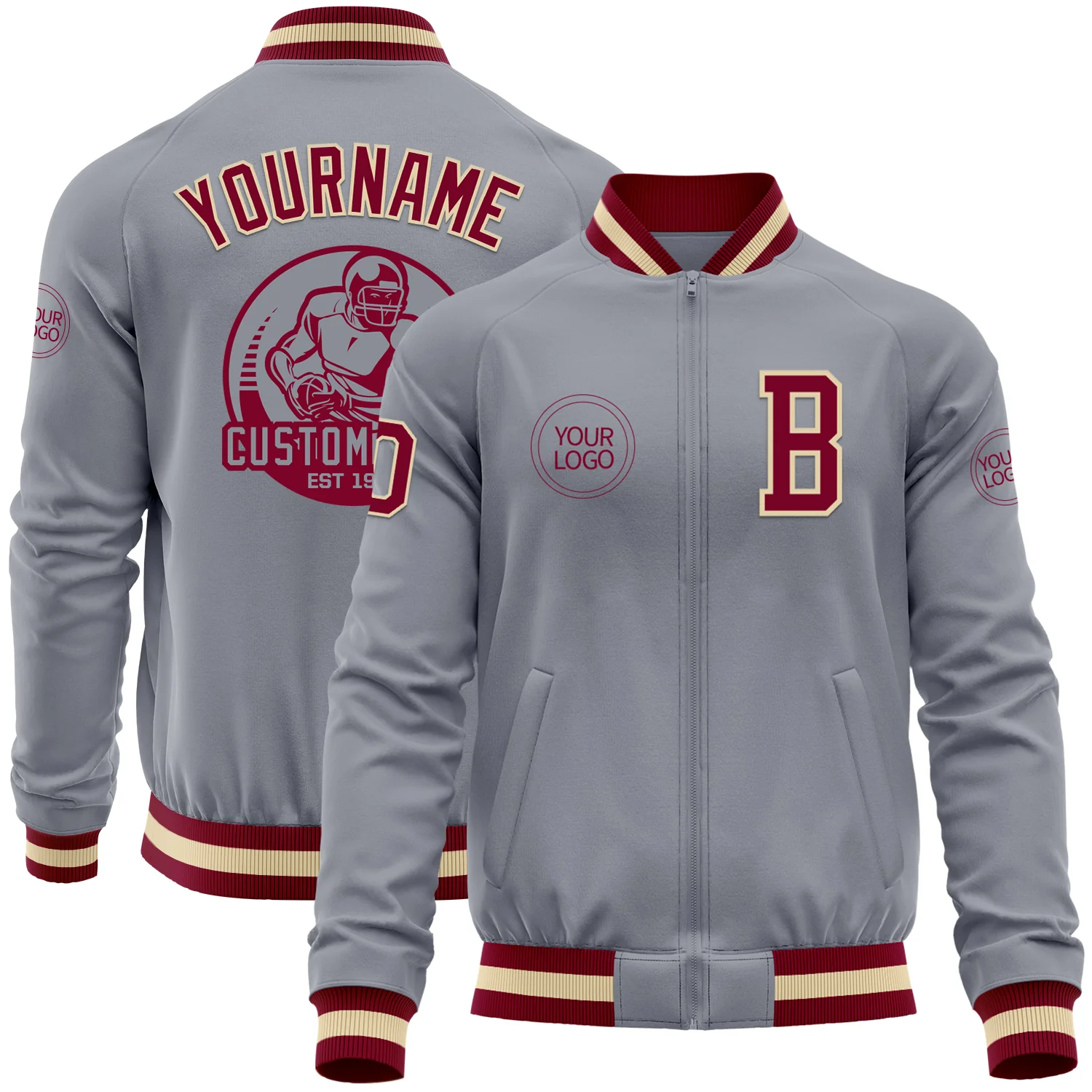 Custom Gray Maroon-Cream Bomber Varsity Letterman Zipper Jacket