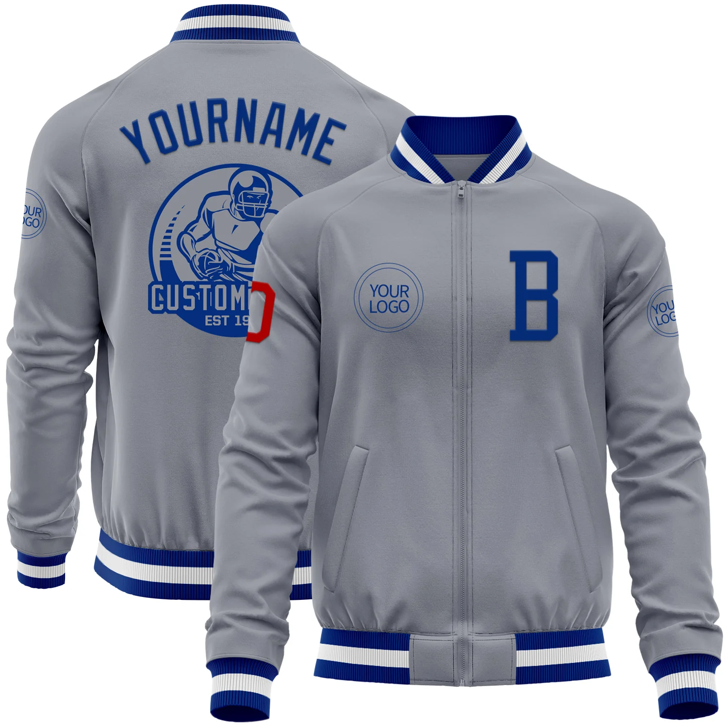 Custom Gray Red-Royal Bomber Varsity Letterman Zipper Jacket