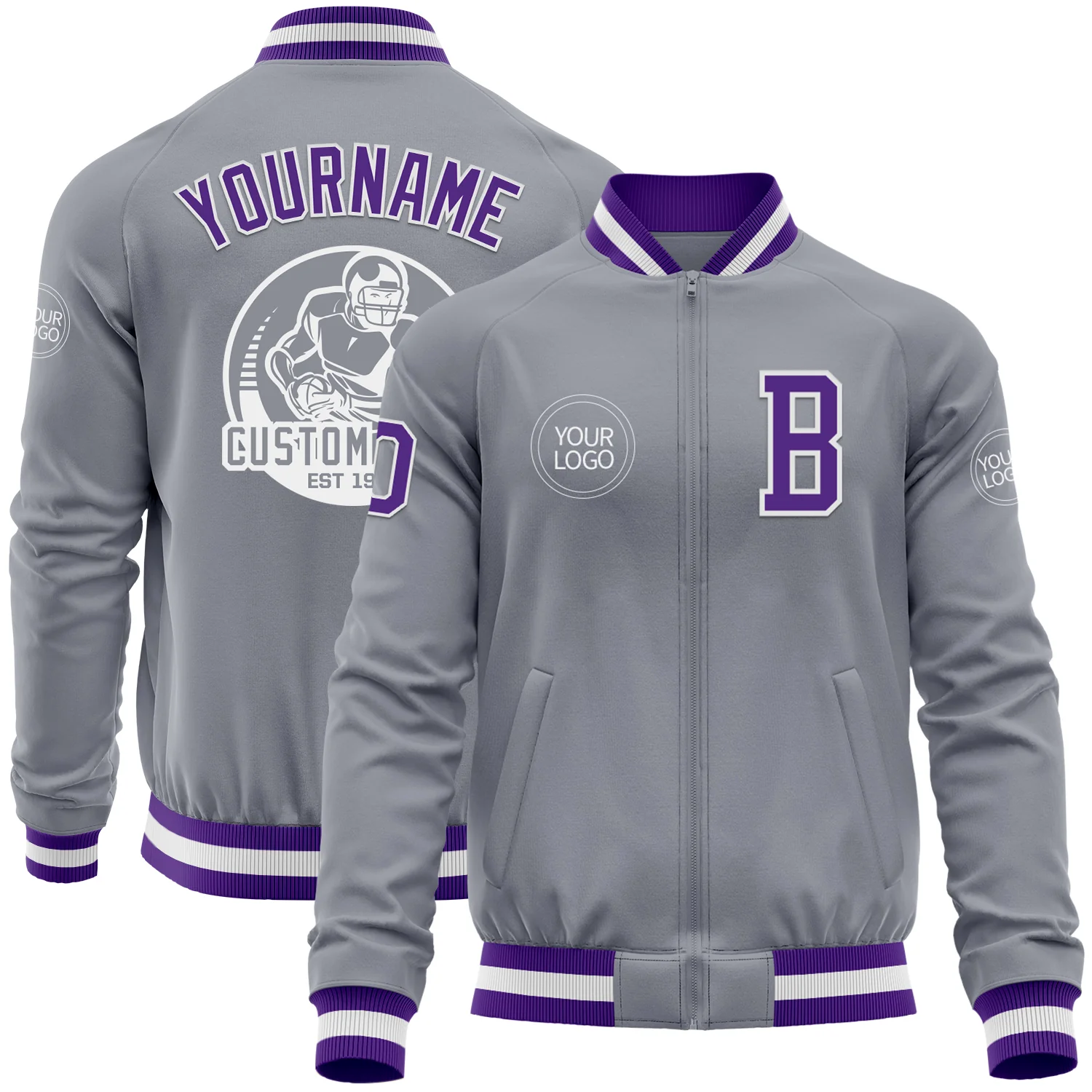 Custom Gray Purple-White Bomber Varsity Letterman Zipper Jacket