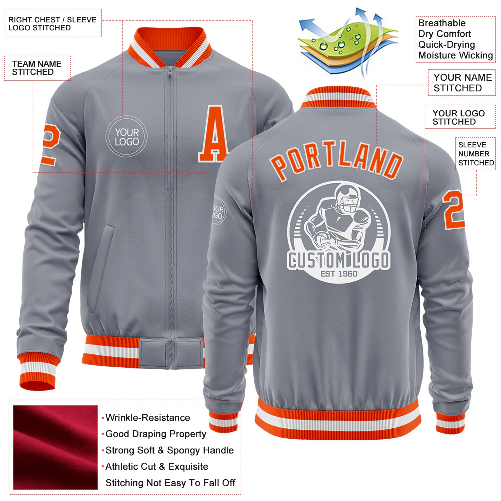 Custom Gray Orange-White Bomber Varsity Letterman Zipper Jacket