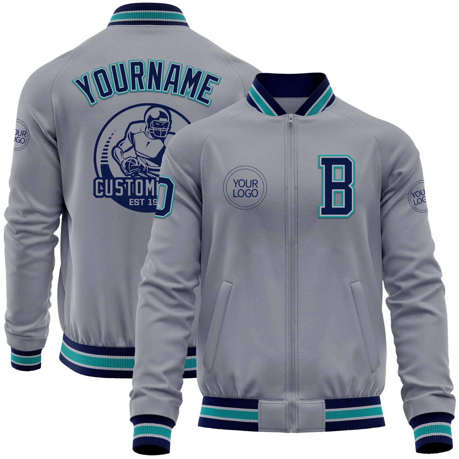 Custom Gray Navy-Teal Bomber Varsity Letterman Zipper Jacket