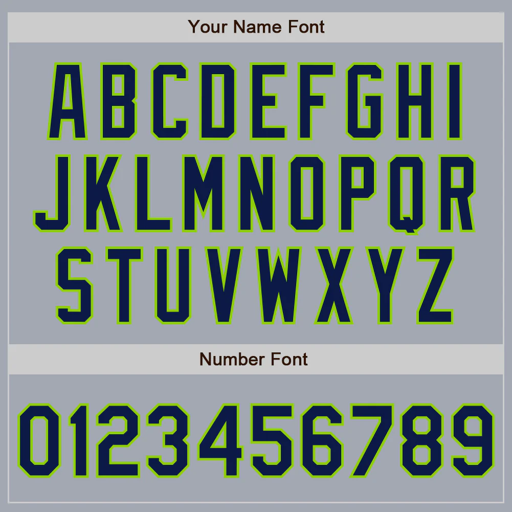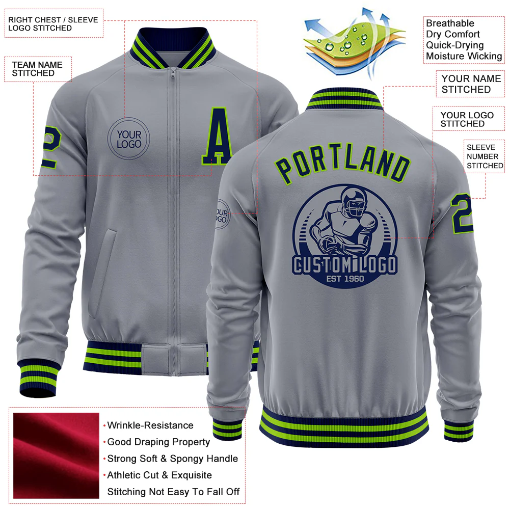 Custom Gray Navy-Neon Green Bomber Varsity Letterman Zipper Jacket