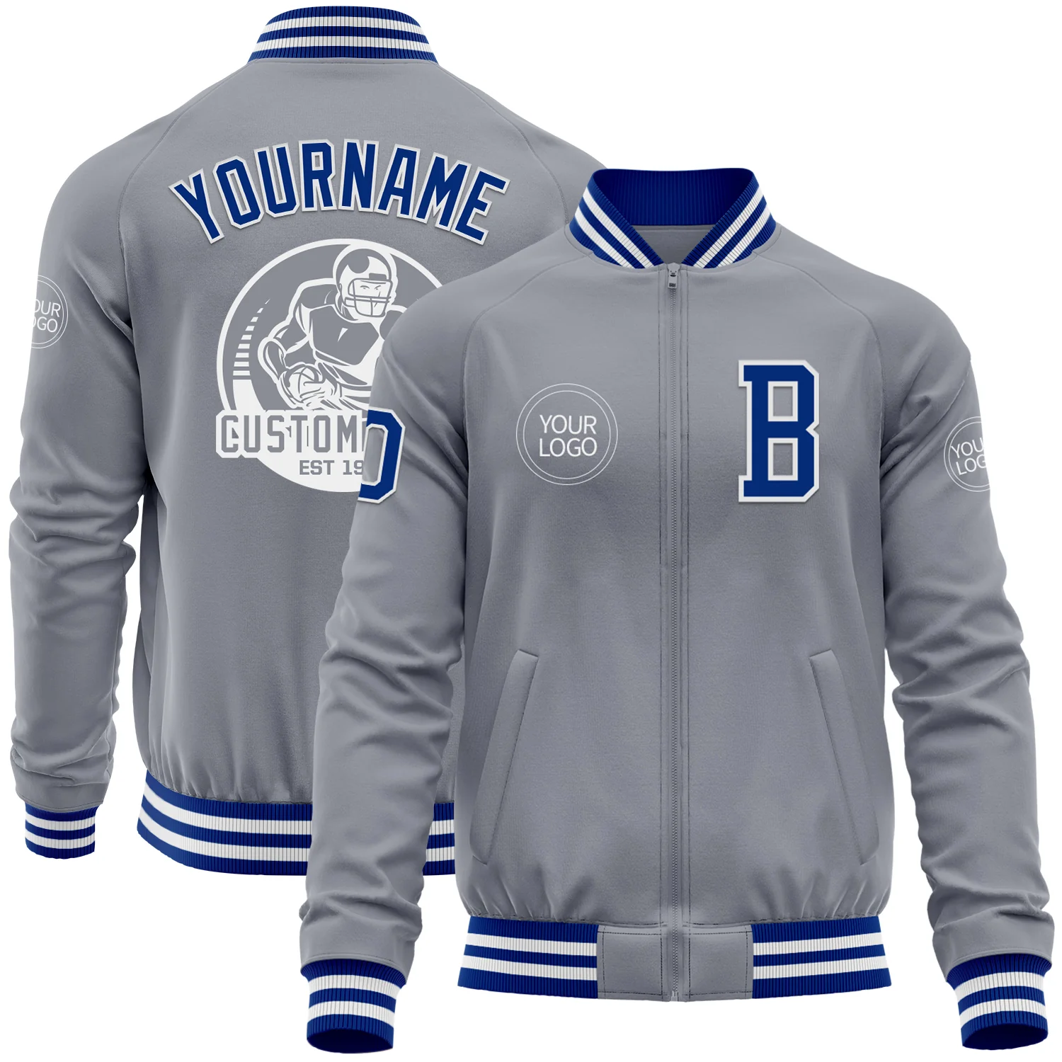 Custom Gray Royal-White Bomber Varsity Letterman Zipper Jacket