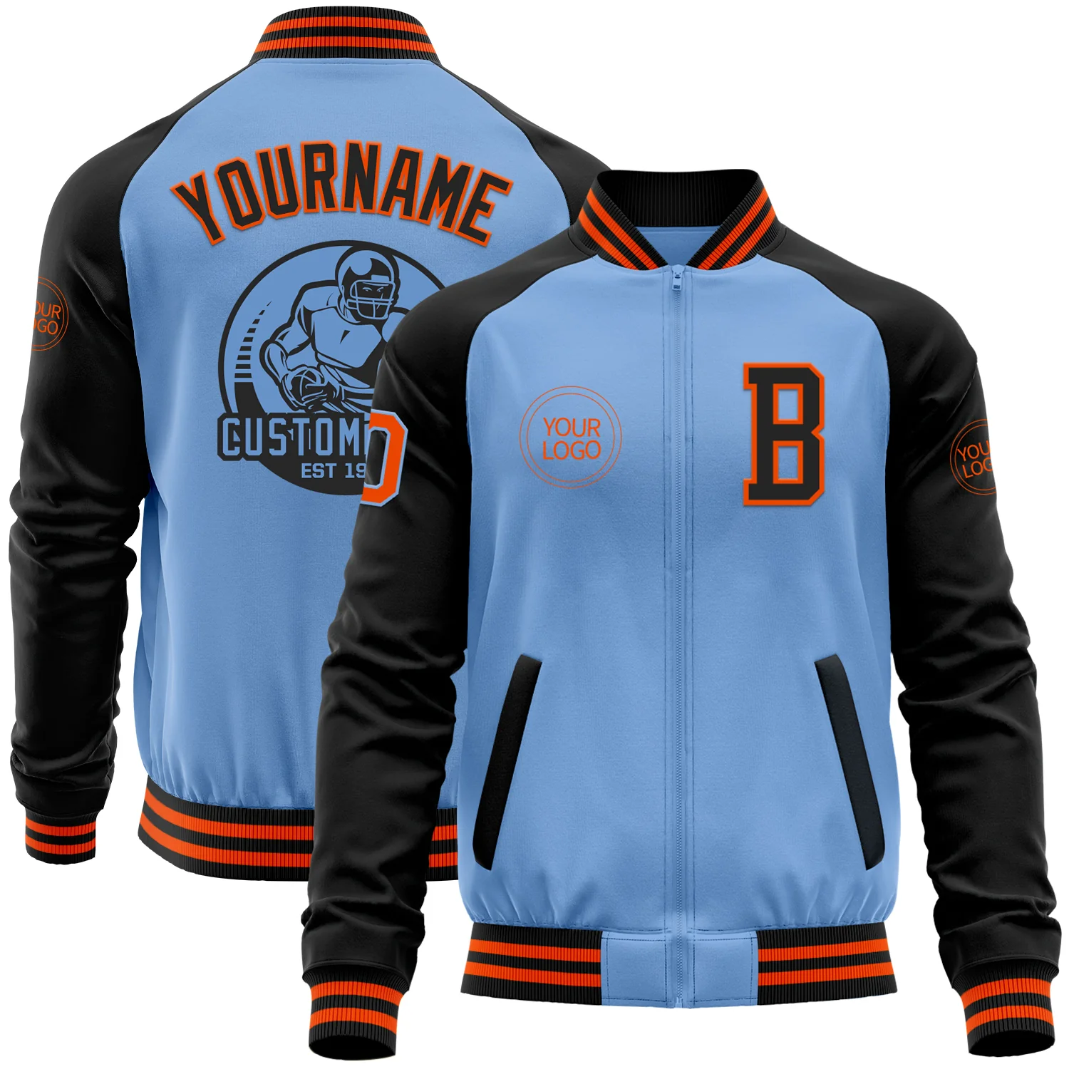 Custom Light Blue Orange-Black Bomber Varsity Letterman Two Tone Zipper Jacket