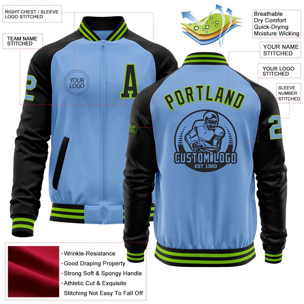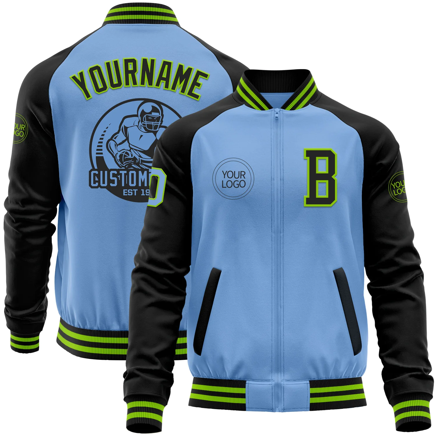 Custom Light Blue Neon Green-Black Bomber Varsity Letterman Two Tone Zipper Jacket