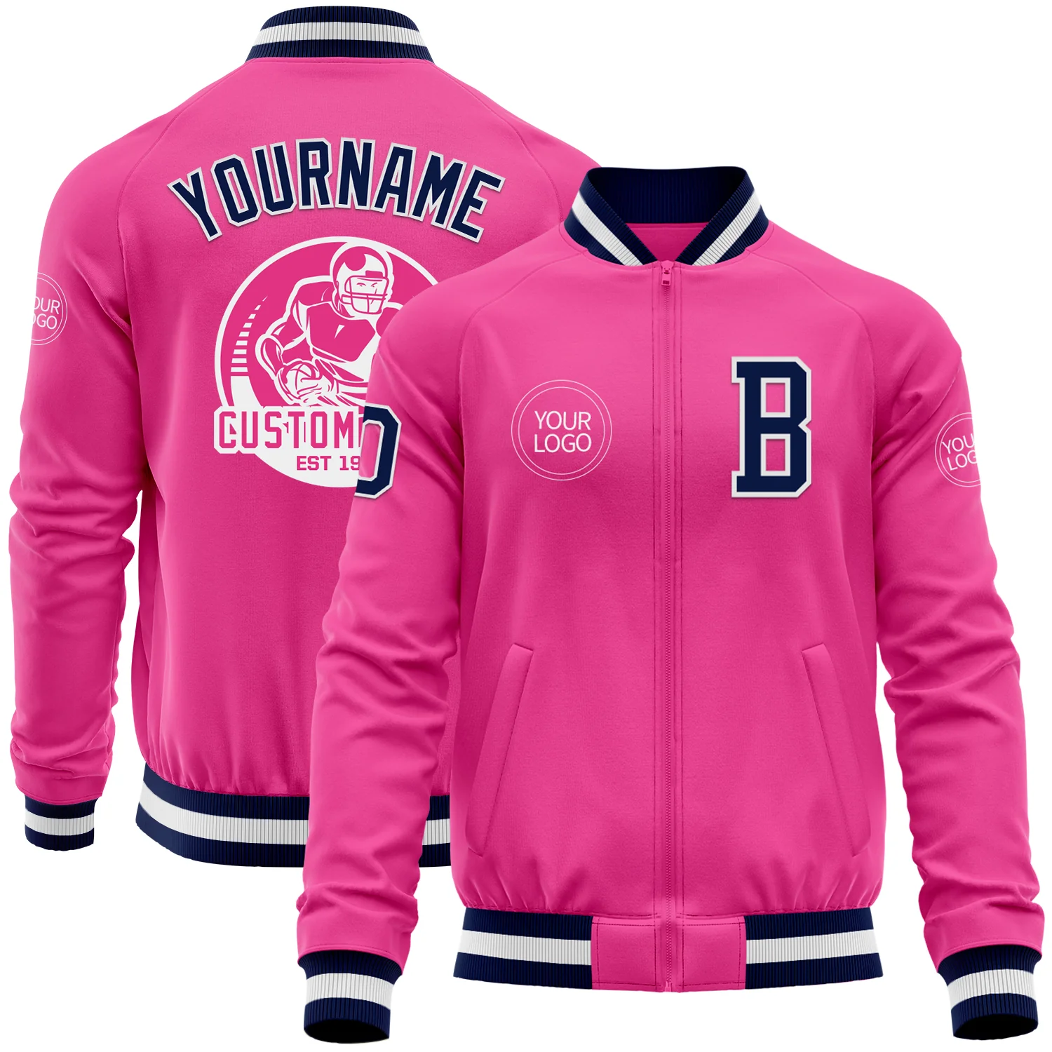 Custom Pink Navy-White Bomber Varsity Letterman Zipper Jacket