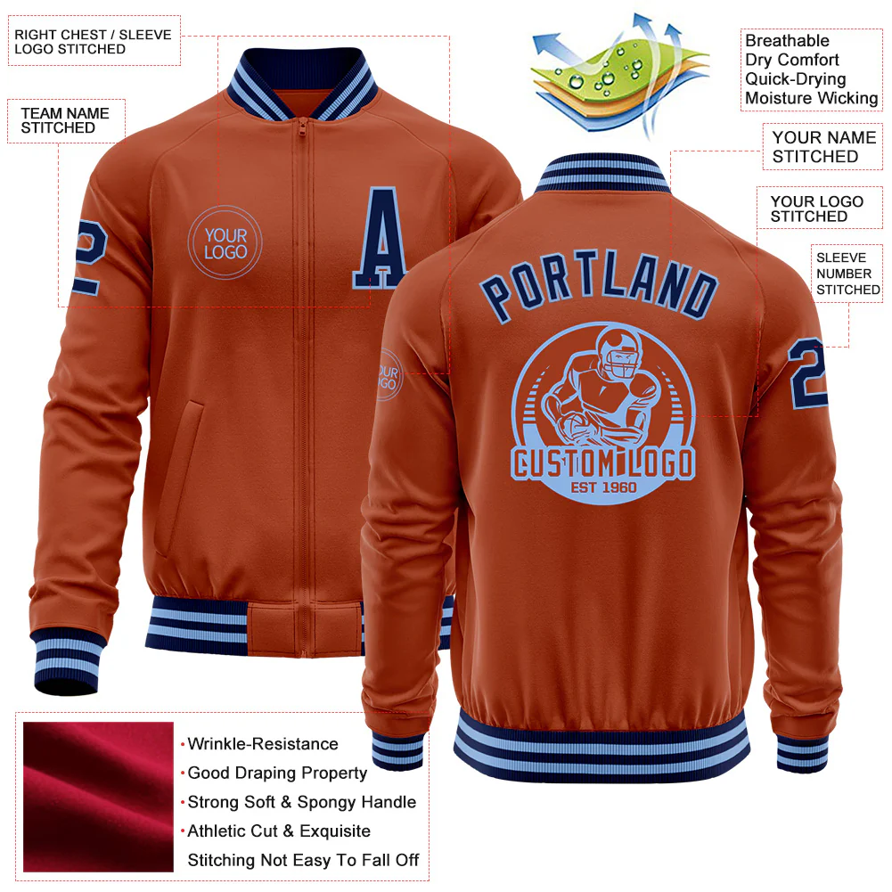 Custom Texas Orange Navy-Light Blue Bomber Varsity Letterman Zipper Jacket