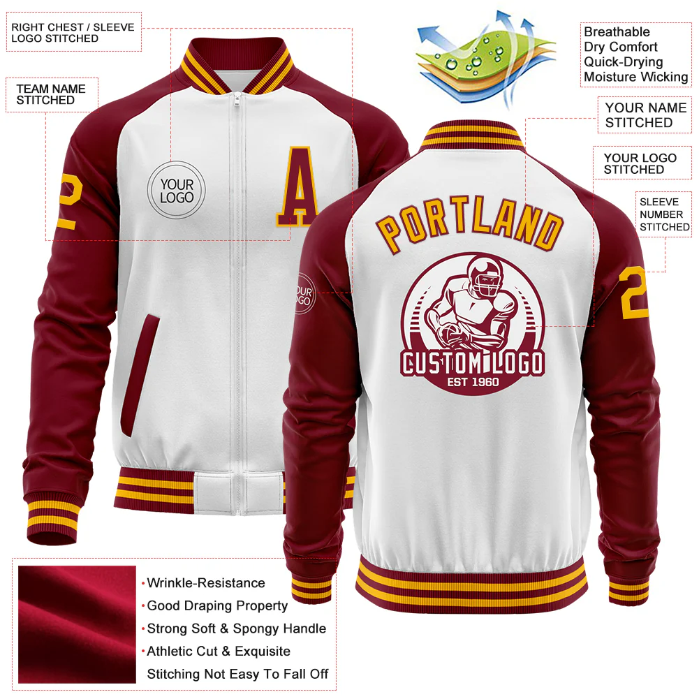 Custom White Gold-Crimson Bomber Varsity Letterman Two Tone Zipper Jacket