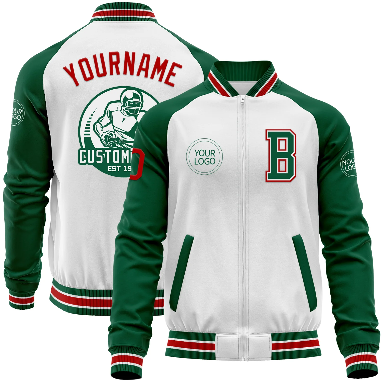 Custom White Red-Kelly Green Bomber Varsity Letterman Two Tone Zipper Jacket