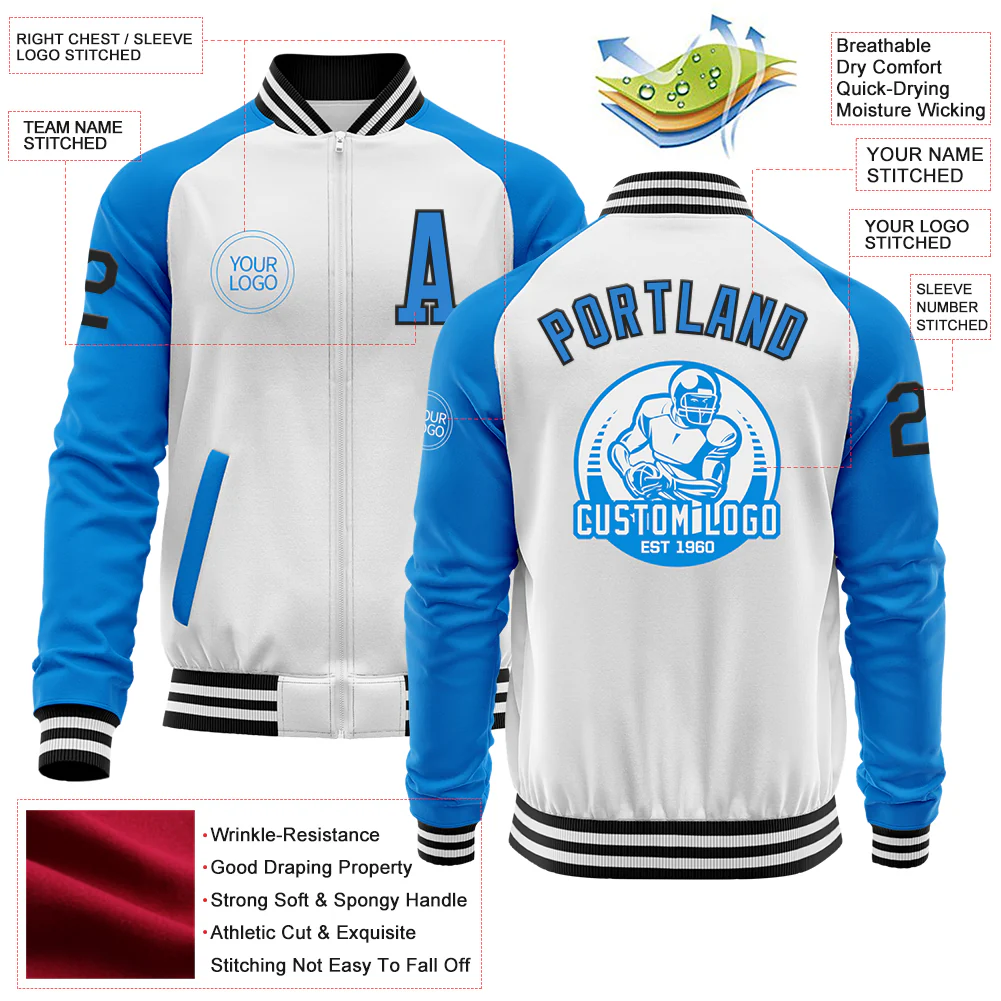 Custom White Black-Powder Blue Bomber Varsity Letterman Two Tone Zipper Jacket
