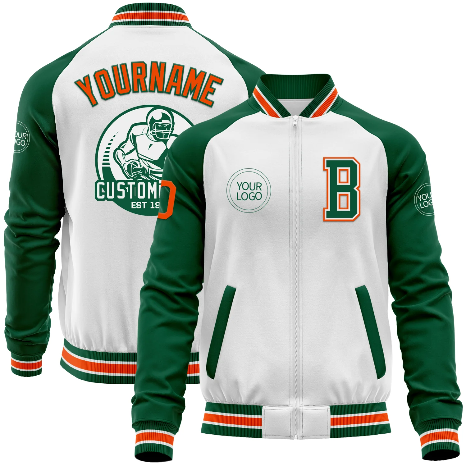 Custom White Kelly Green-Orange Bomber Varsity Letterman Two Tone Zipper Jacket
