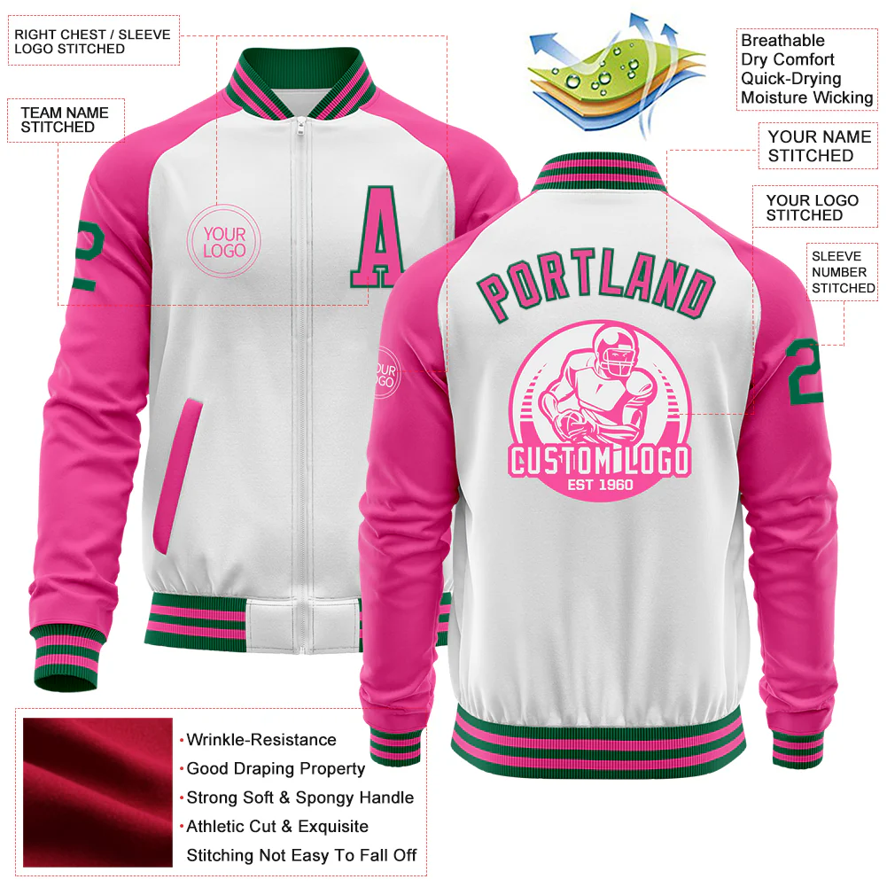 Custom White Kelly Green-Pink Bomber Varsity Letterman Two Tone Zipper Jacket
