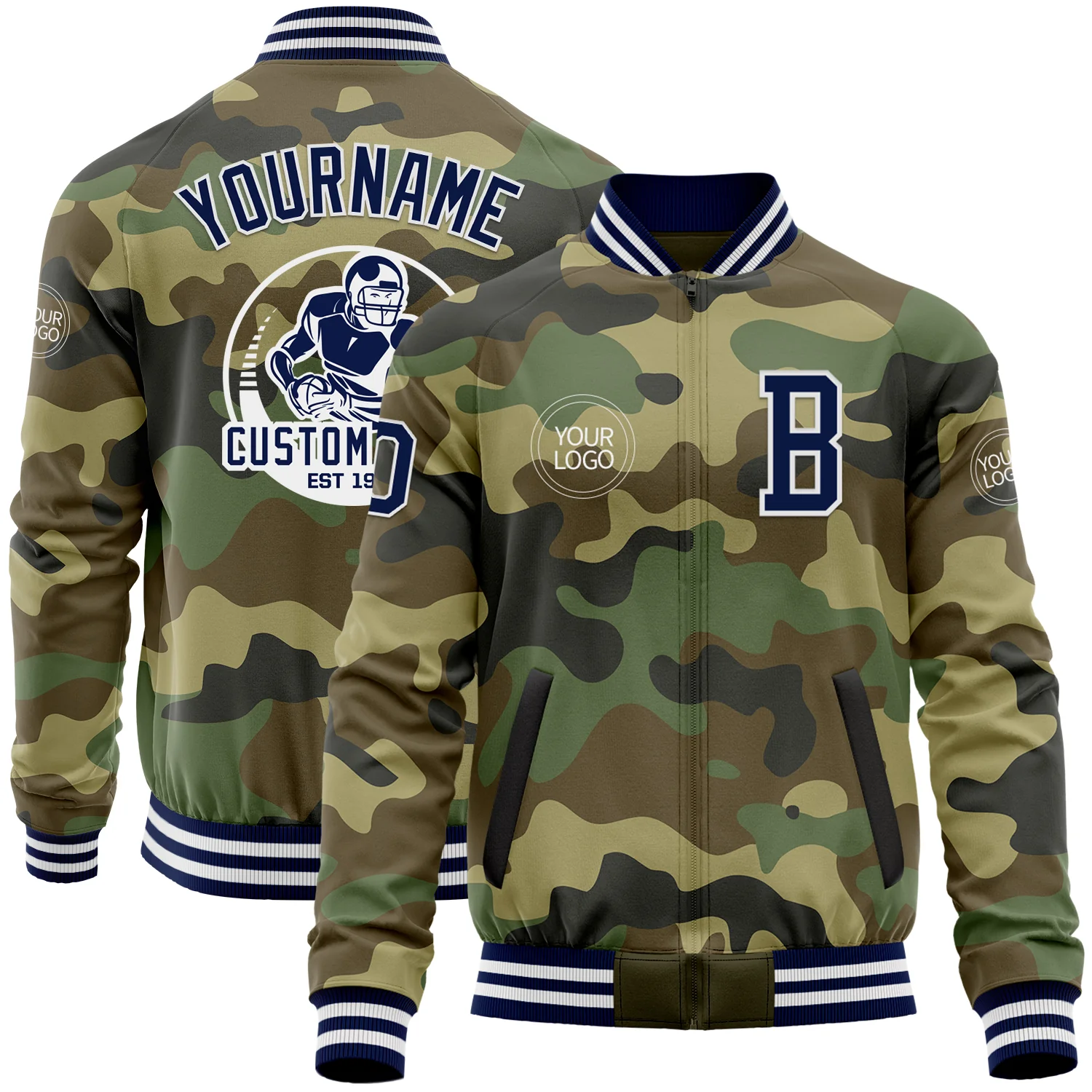 Custom Camo Navy-White Bomber Varsity Letterman Salute To Service Zipper Jacket