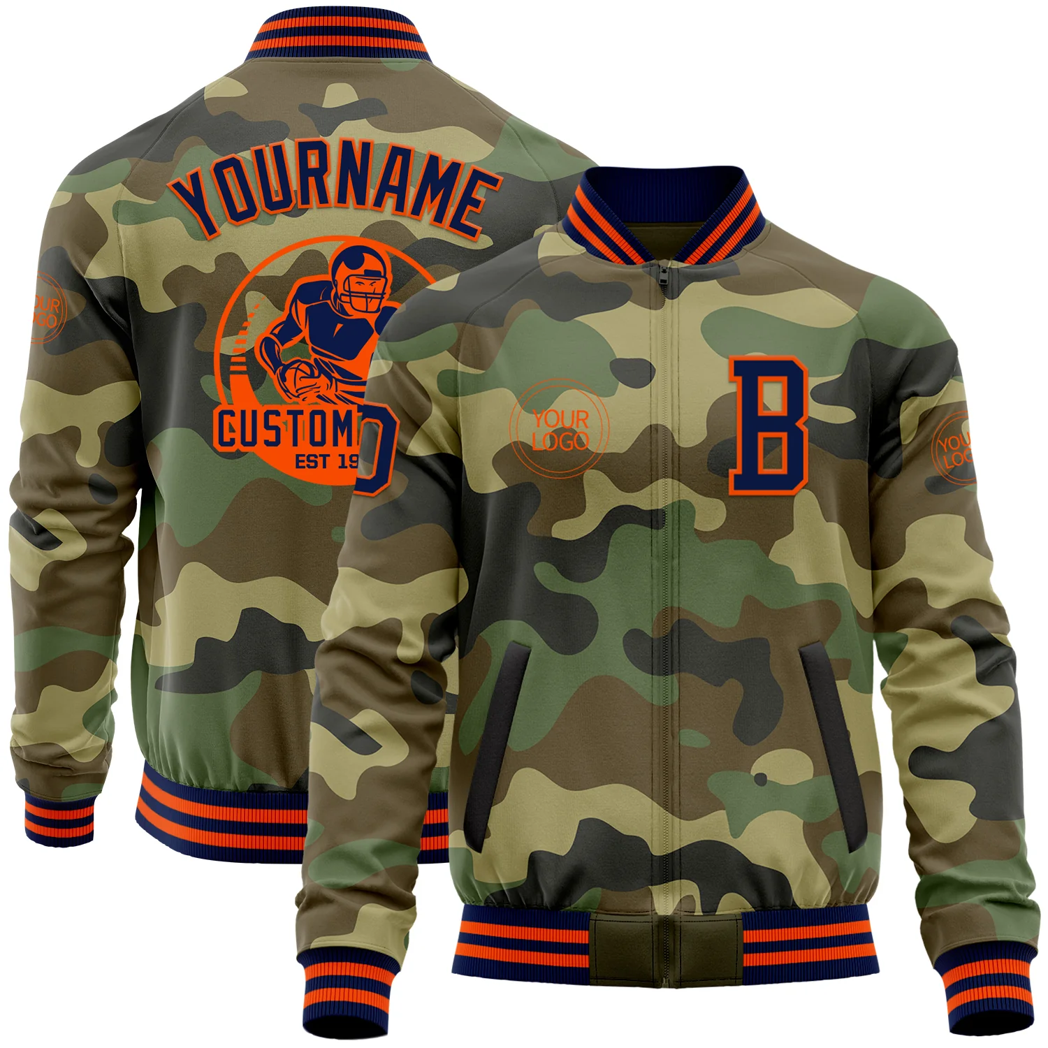 Custom Camo Navy-Orange Bomber Varsity Letterman Salute To Service Zipper Jacket