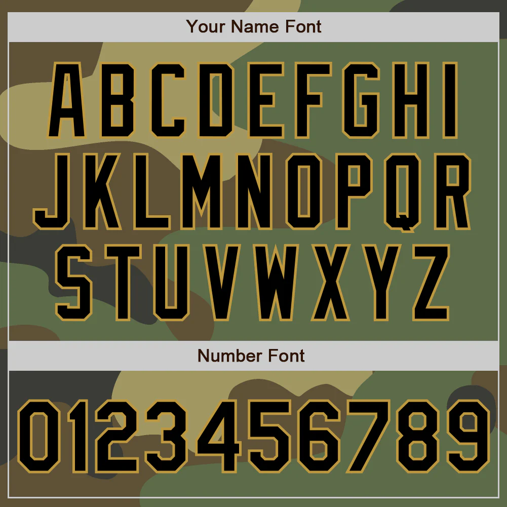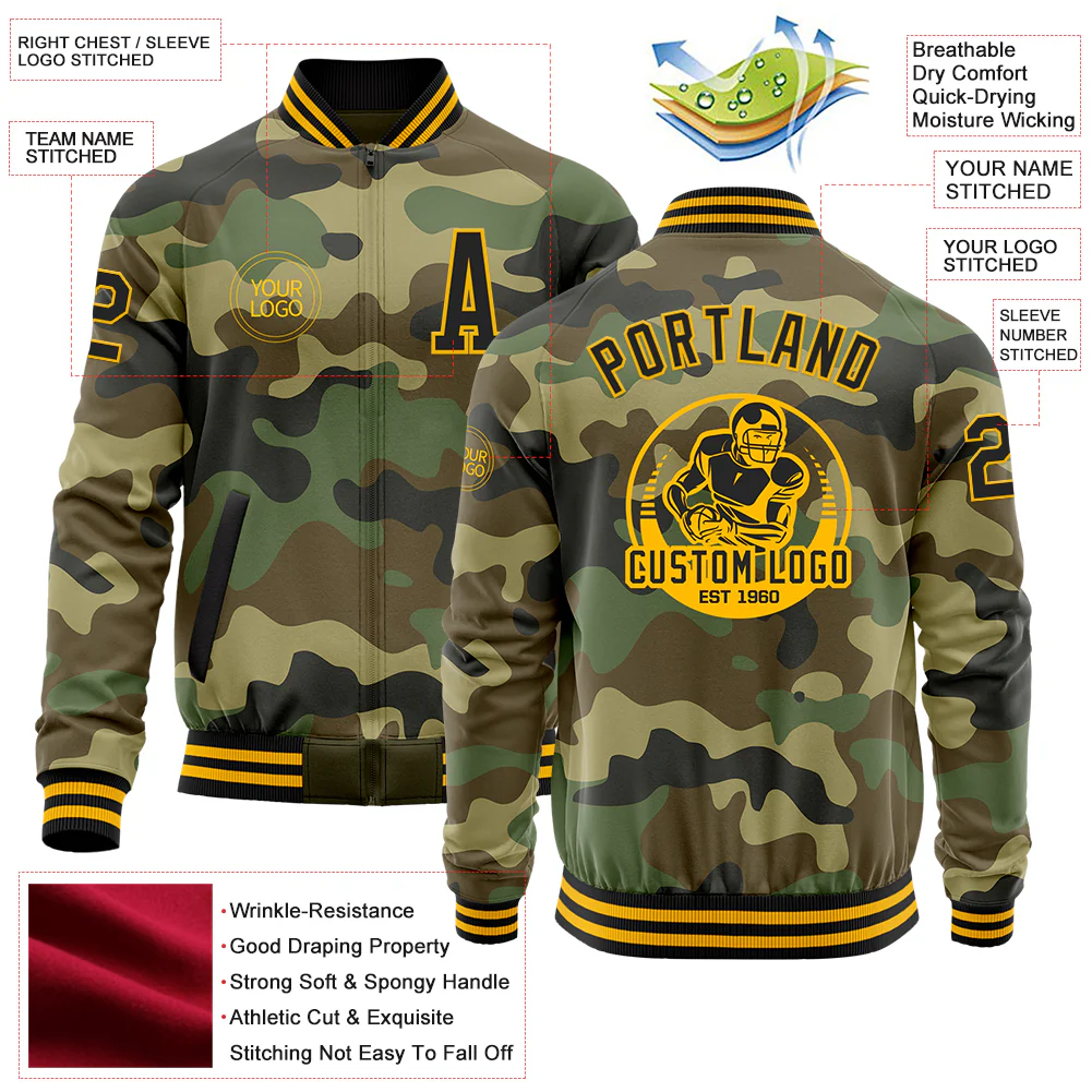 Custom Camo Black-Old Gold Bomber Varsity Letterman Salute To Service Zipper Jacket