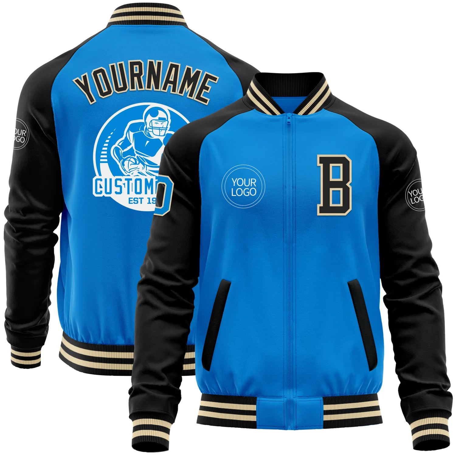 Custom Powder Blue Cream-Black Bomber Varsity Letterman Two Tone Zipper Jacket