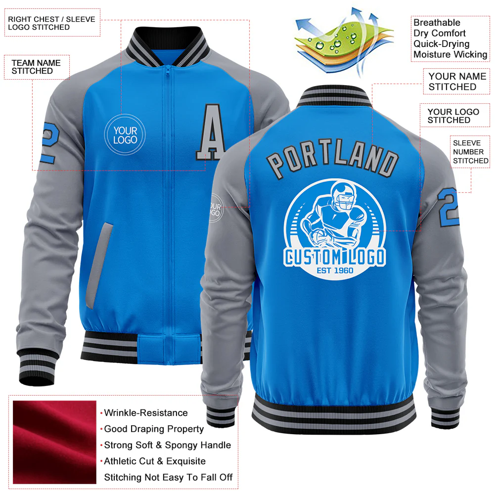 Custom Powder Blue Black-Gray Bomber Varsity Letterman Two Tone Zipper Jacket