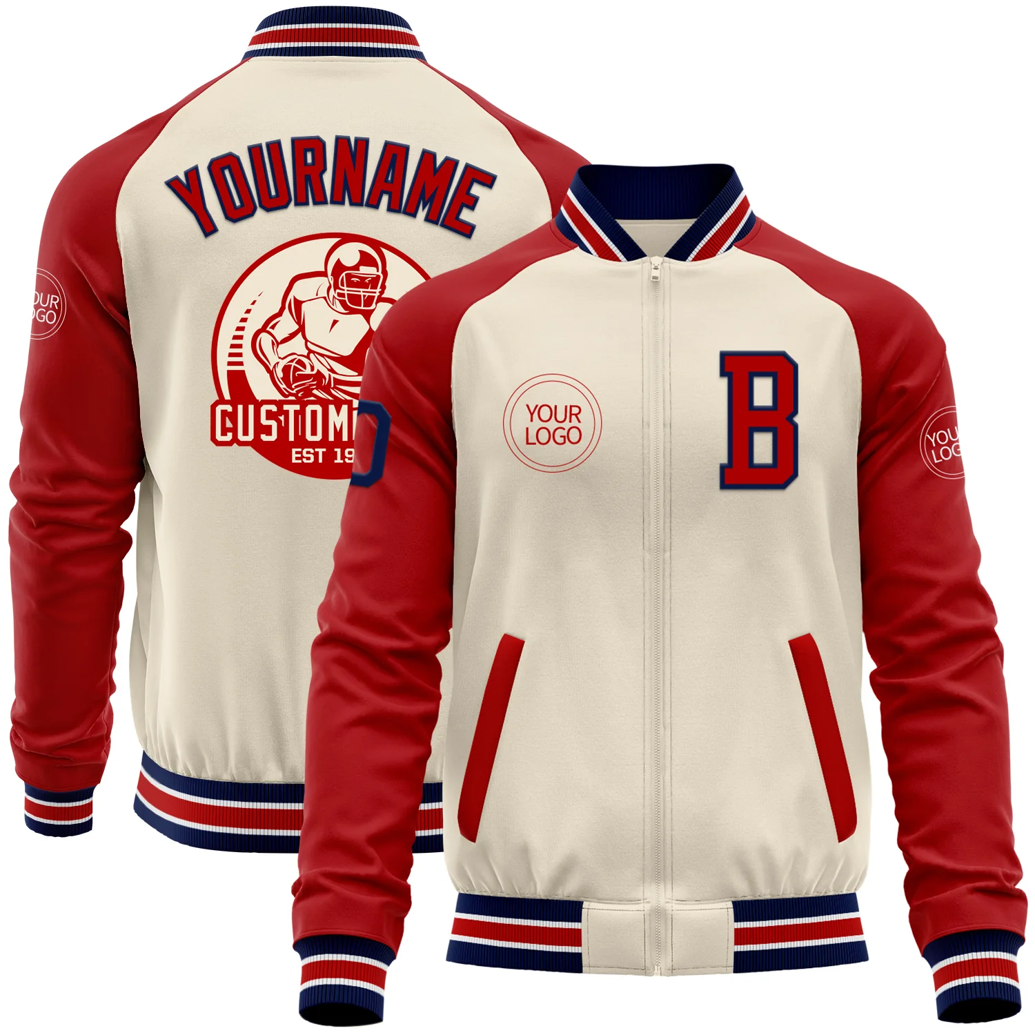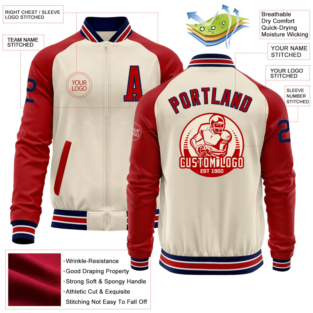 Custom Cream Navy Red-White Bomber Varsity Letterman Two Tone Zipper Jacket