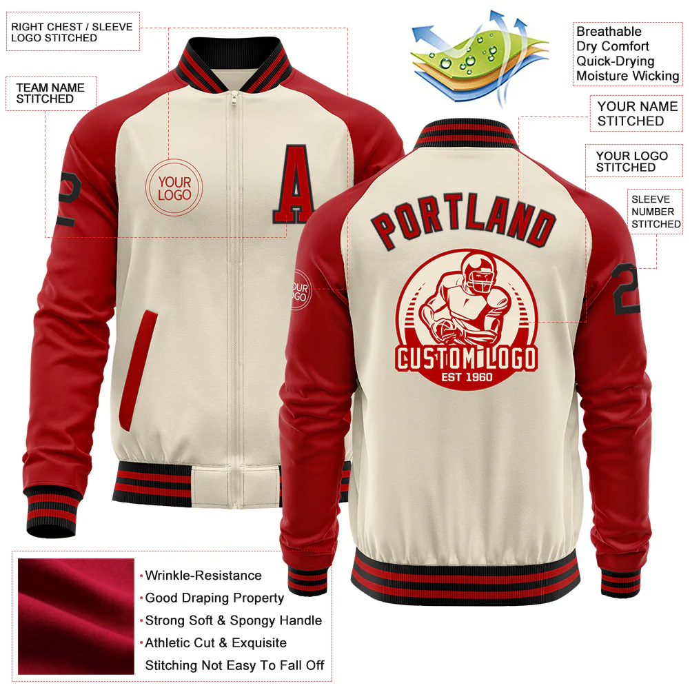 Custom Cream Crimson Black-City Cream Bomber Varsity Letterman Two Tone Zipper Jacket