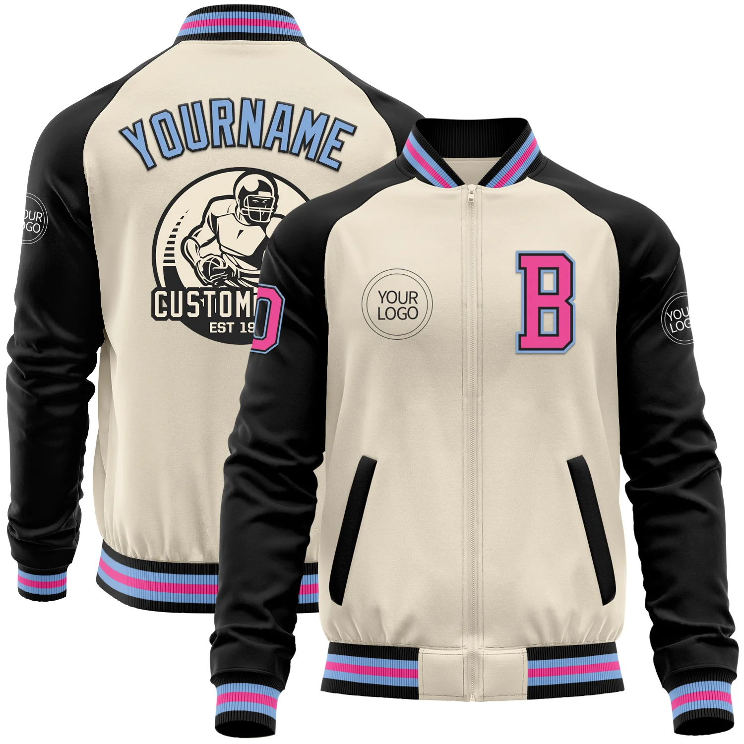 Custom Cream Pink Black-Light Blue Bomber Varsity Letterman Two Tone Zipper Jacket