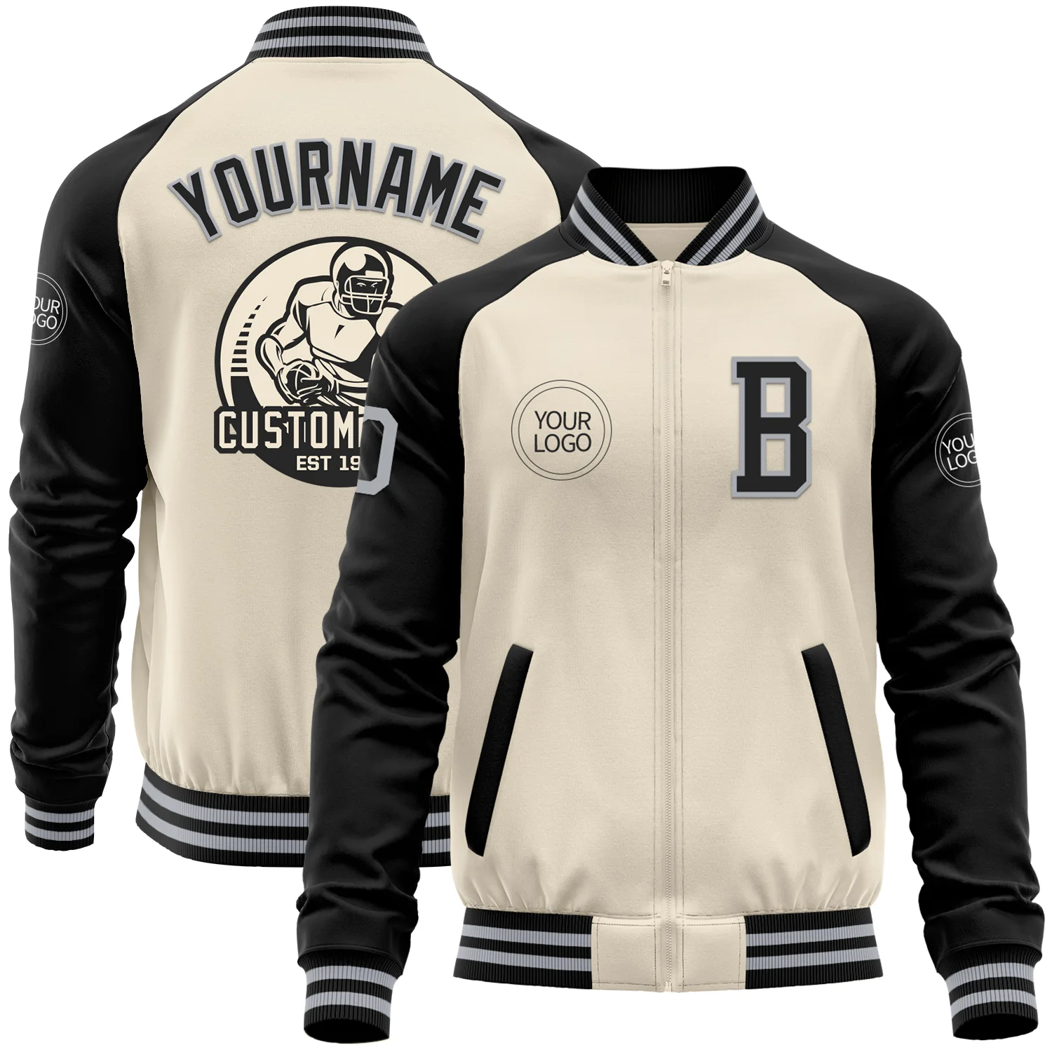 Custom Cream Gray-Black Bomber Varsity Letterman Two Tone Zipper Jacket