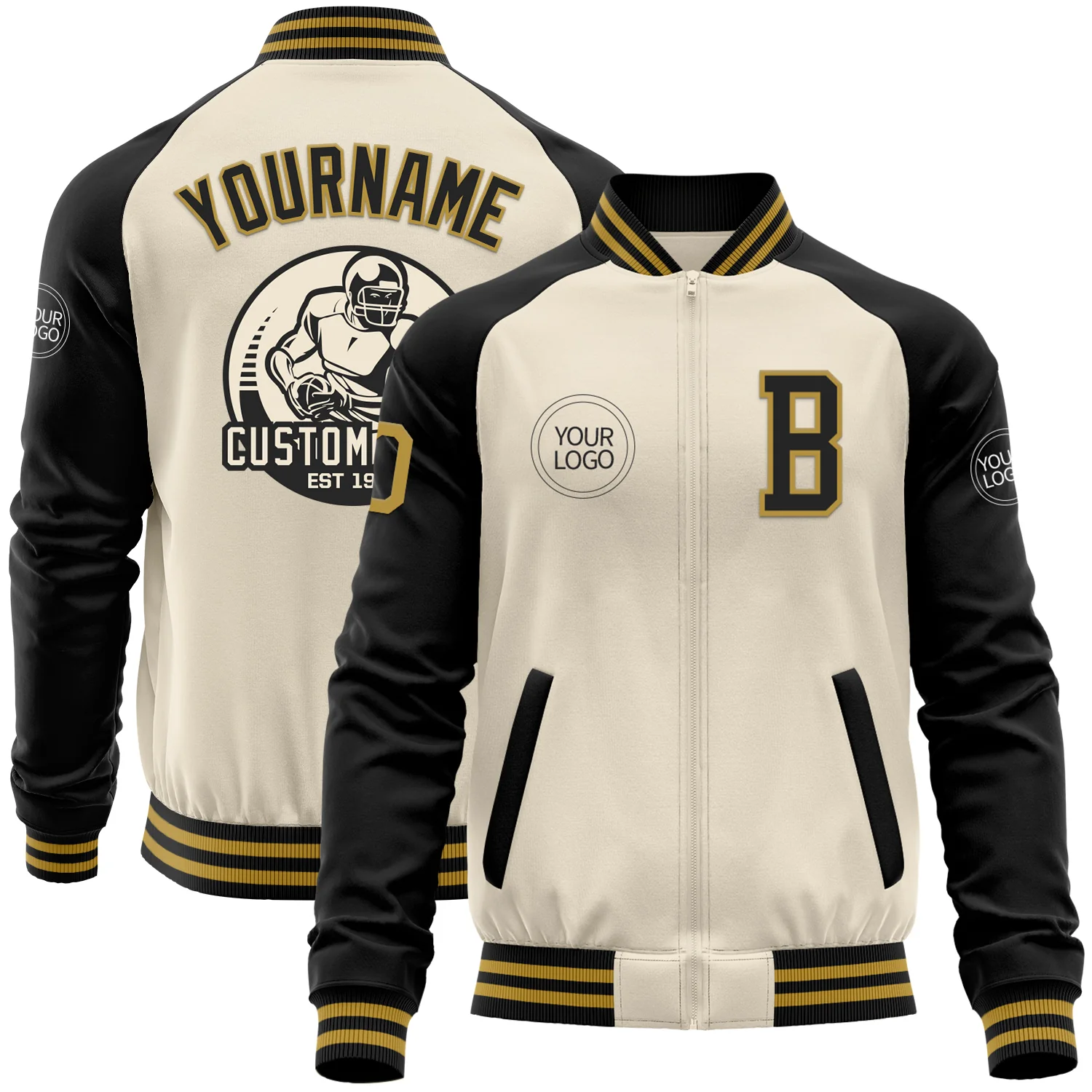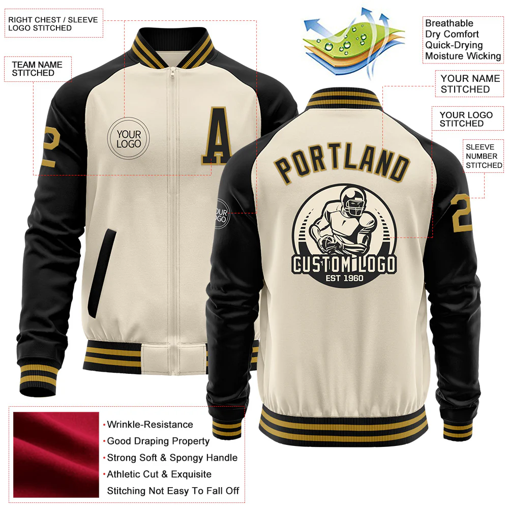 Custom Cream Old Gold-Black Bomber Varsity Letterman Two Tone Zipper Jacket