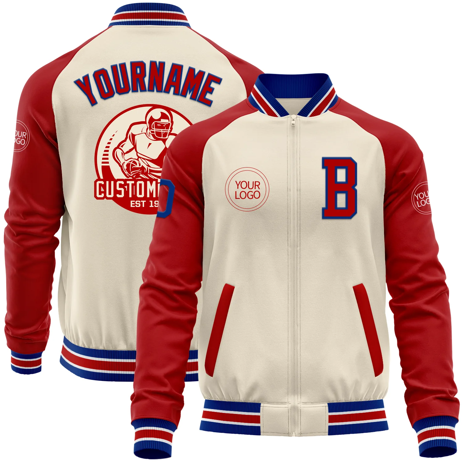 Custom Cream Royal Red-White Bomber Varsity Letterman Two Tone Zipper Jacket