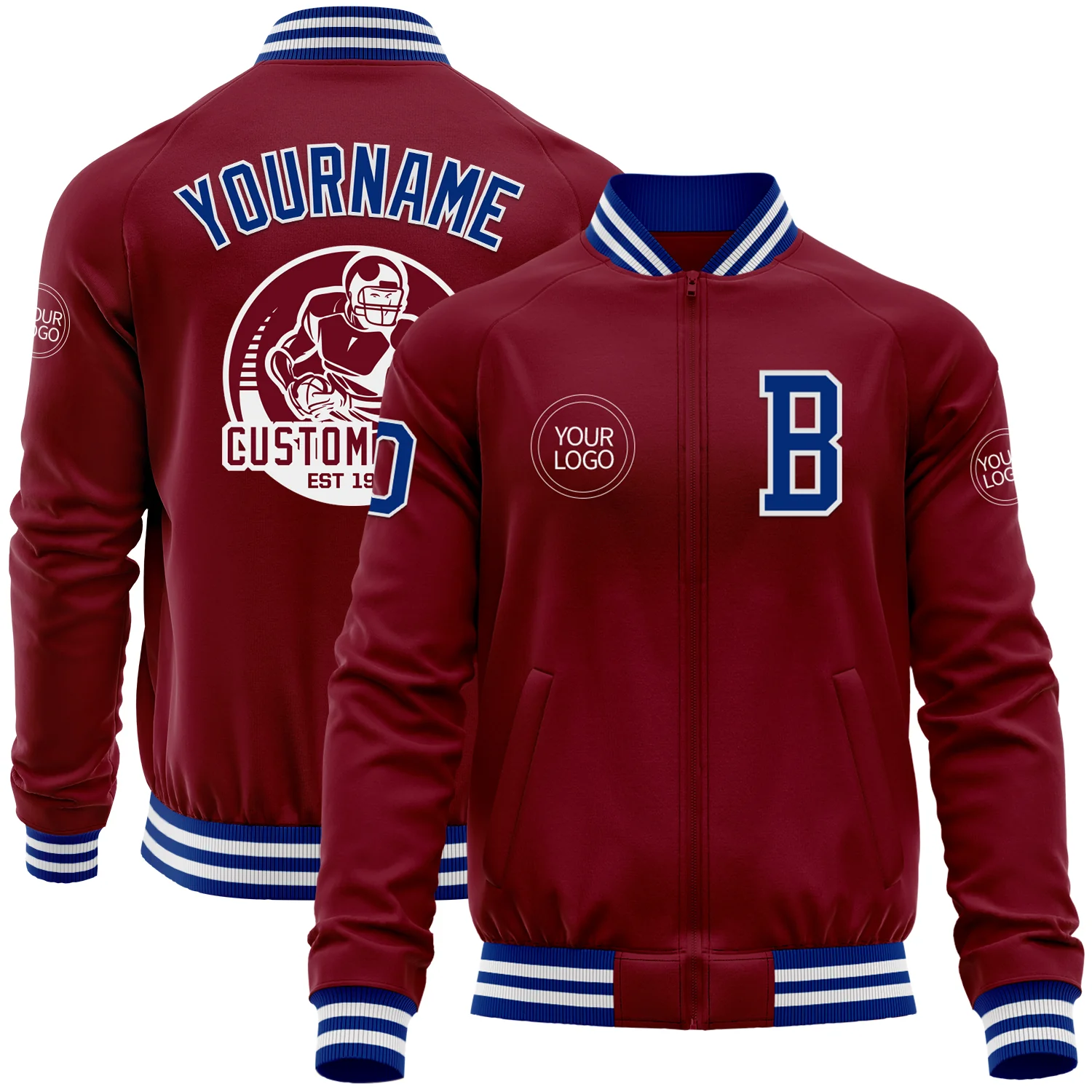 Custom Crimson Royal-White Bomber Varsity Letterman Zipper Jacket