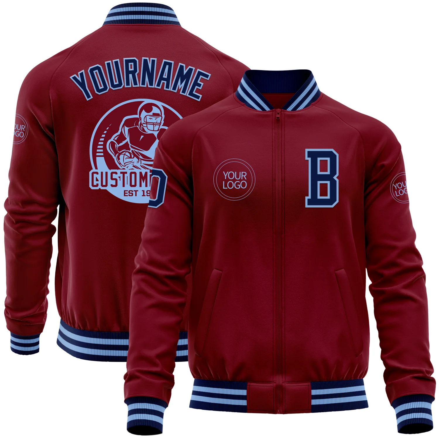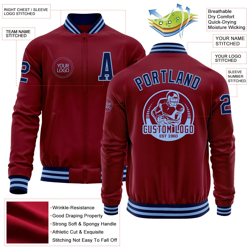 Custom Crimson Navy-Light Blue Bomber Varsity Letterman Zipper Jacket