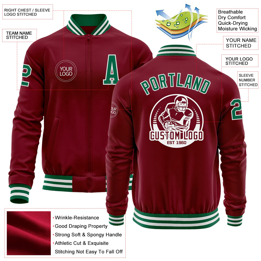 Custom Crimson Kelly Green-White Bomber Varsity Letterman Zipper Jacket