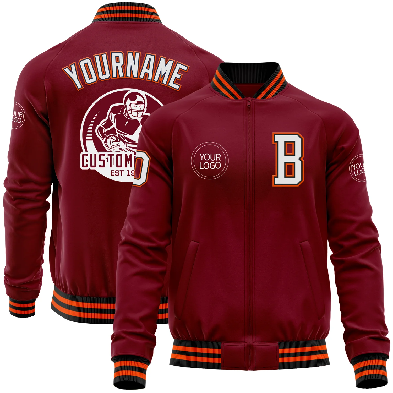Custom Crimson Black-Orange Bomber Varsity Letterman Zipper Jacket