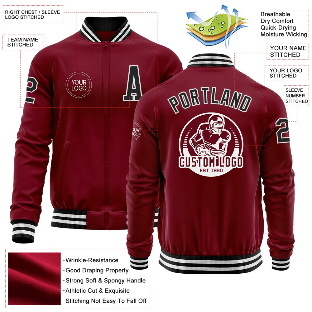Custom Crimson Black-White Bomber Varsity Letterman Zipper Jacket
