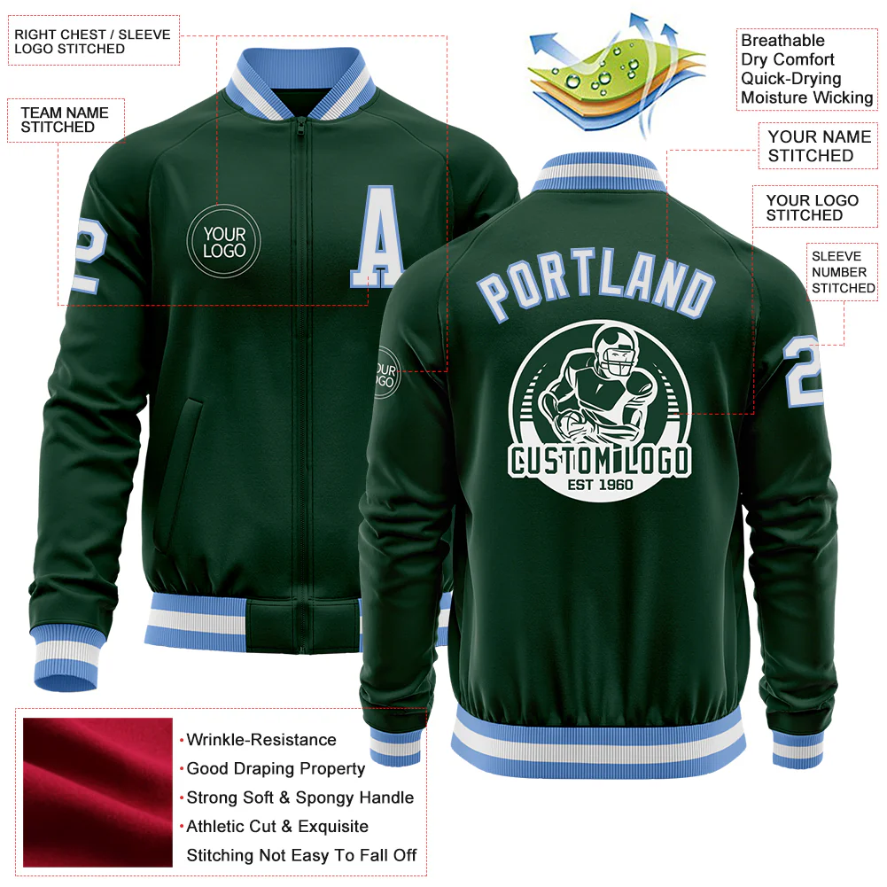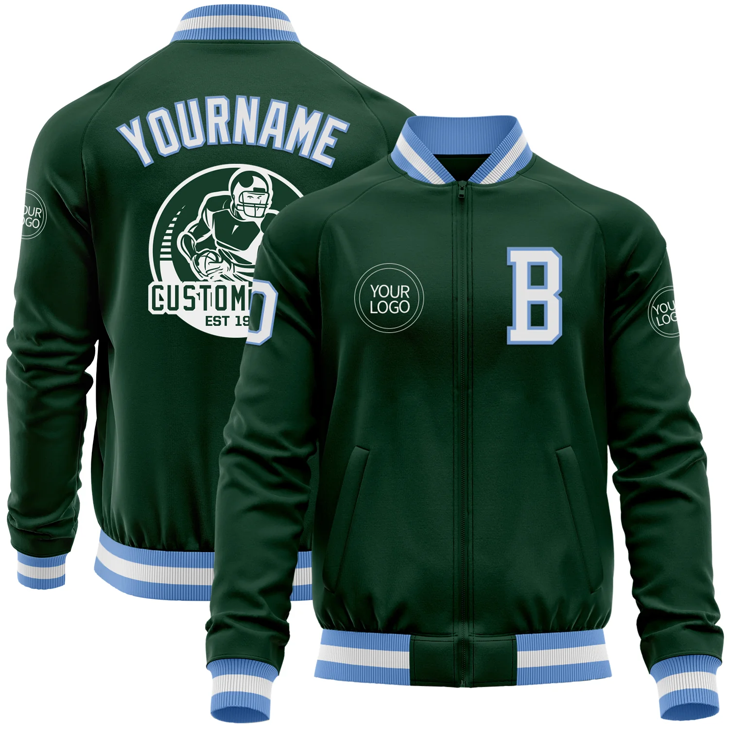 Custom Green White-Light Blue Bomber Varsity Letterman Zipper Jacket