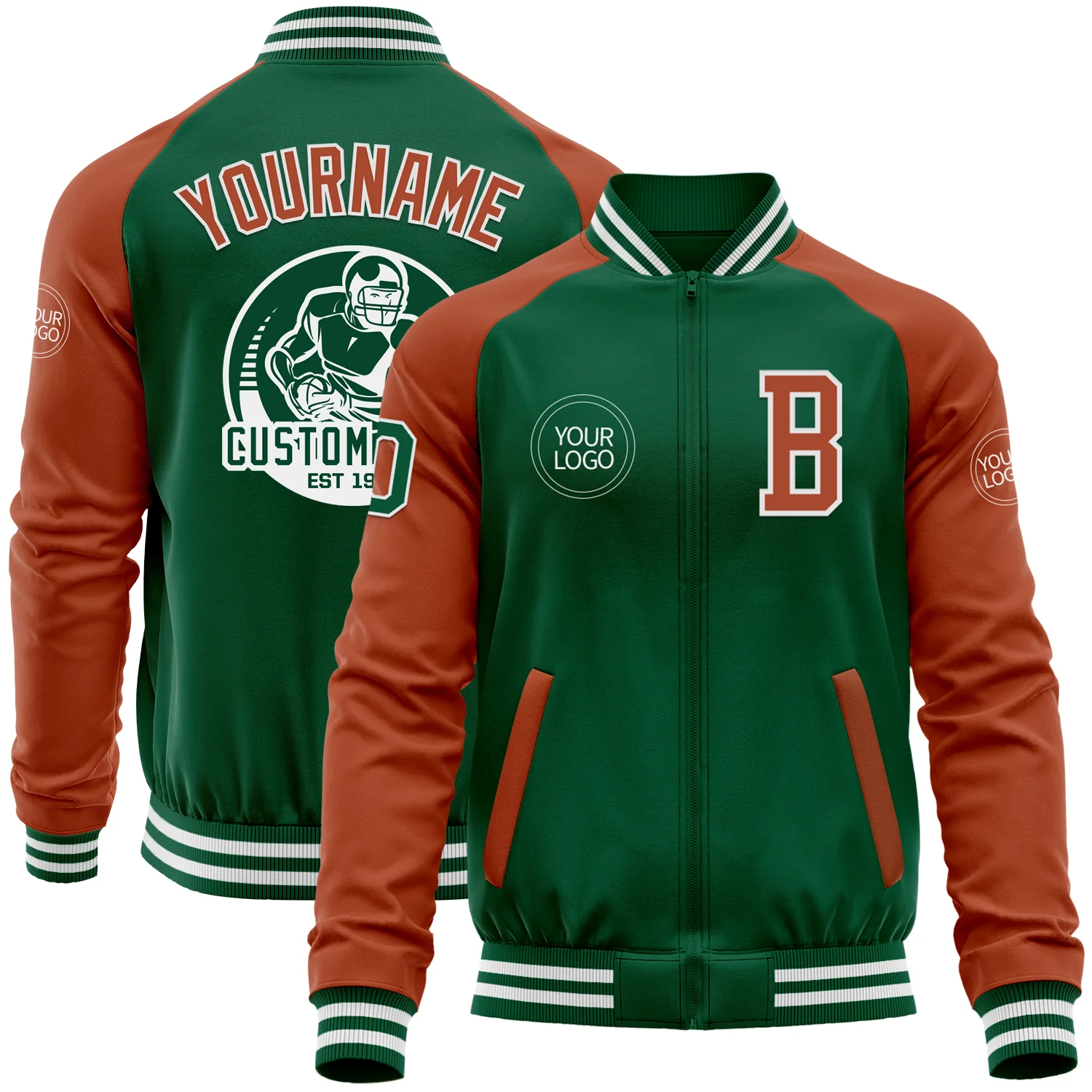 Custom Kelly Green Texas Orange-White Bomber Varsity Letterman Two Tone Zipper Jacket