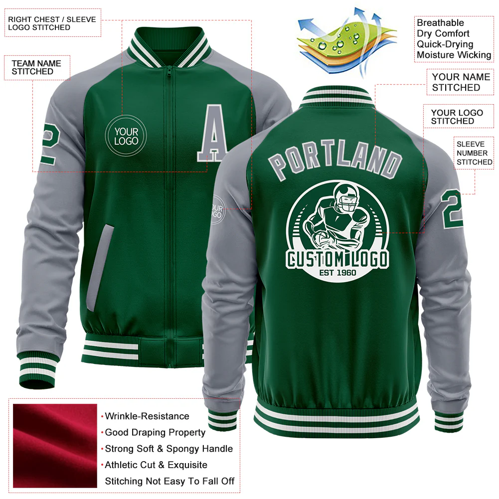 Custom Kelly Green Gray-White Bomber Varsity Letterman Two Tone Zipper Jacket