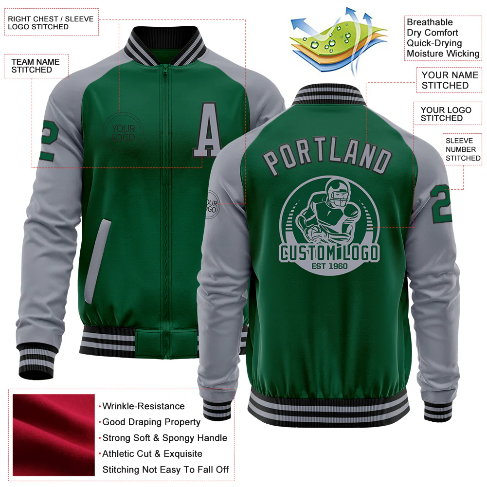 Custom Kelly Green Gray-Black Bomber Varsity Letterman Two Tone Zipper Jacket