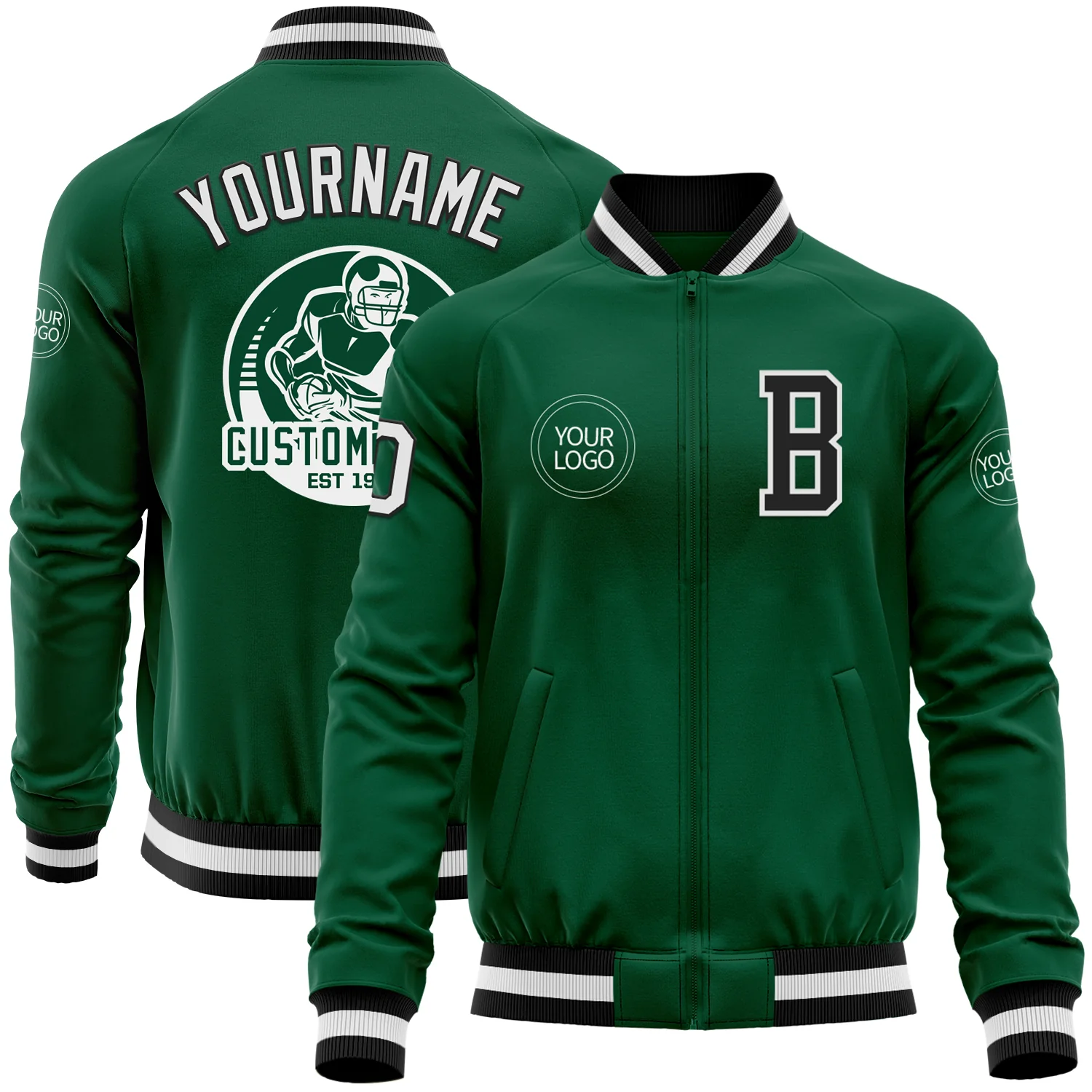 Custom Kelly Green Black-White Bomber Varsity Letterman Zipper Jacket