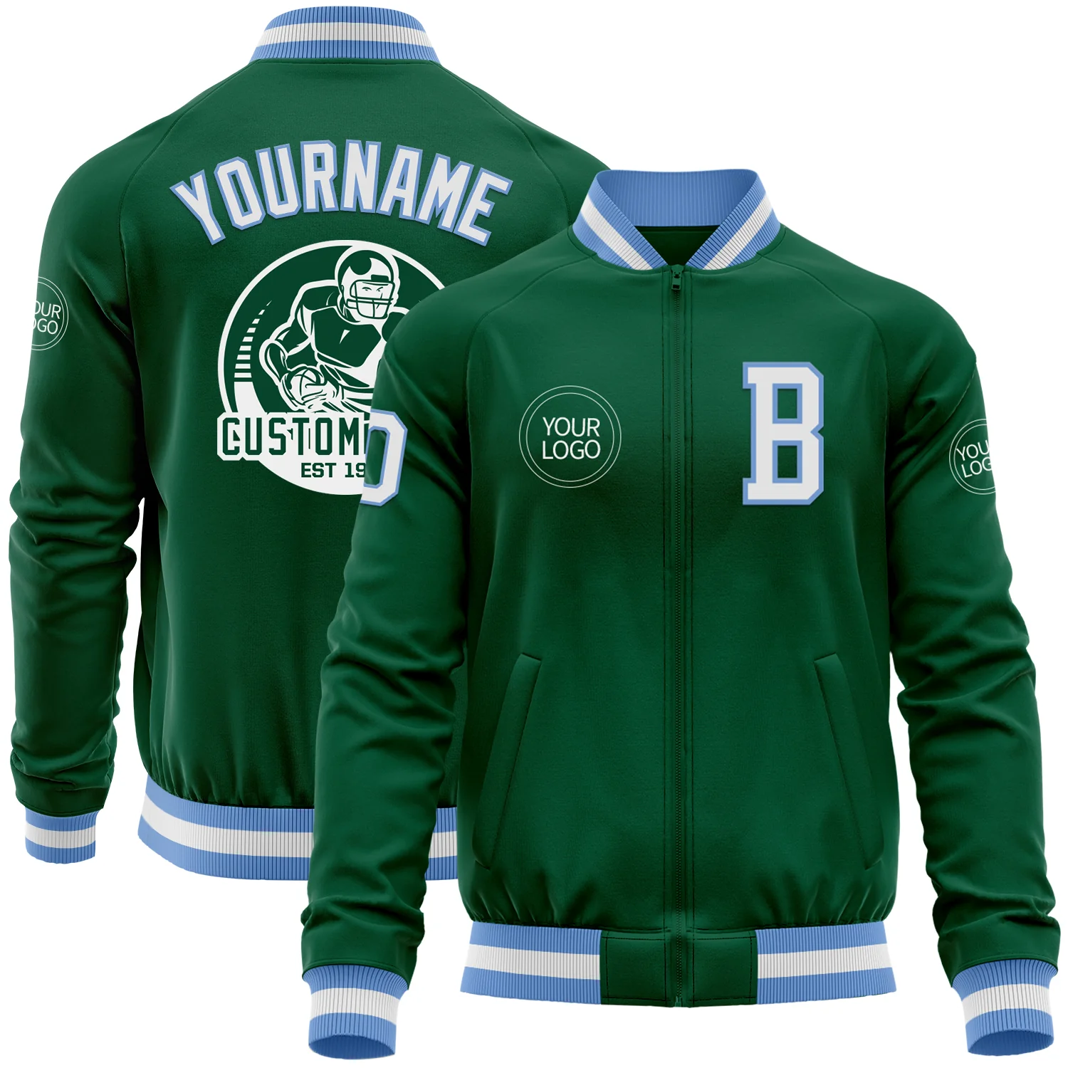 Custom Kelly Green White-Light Blue Bomber Varsity Letterman Zipper Jacket