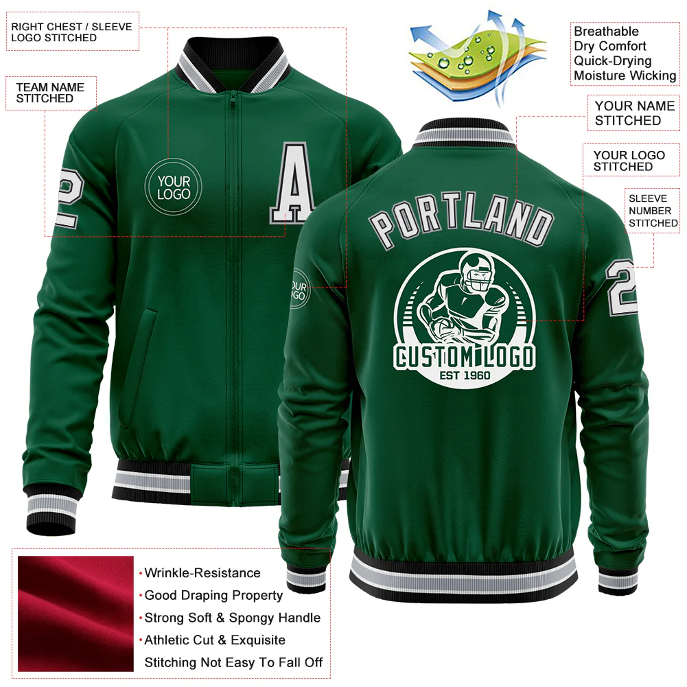 Custom Kelly Green White Bomber Varsity Letterman Zipper Jacket